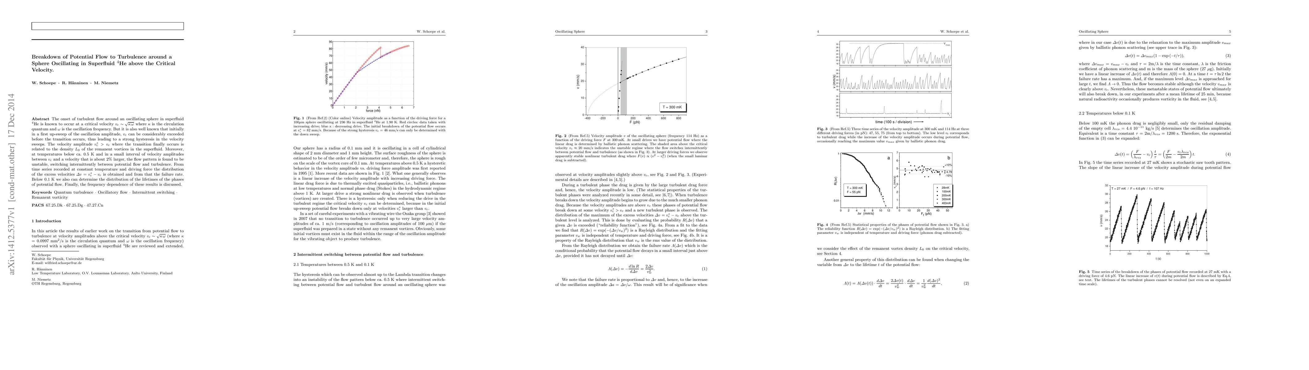 This study investigates the transition from potential flow to turbulence around an oscillating sphere in superfluid $^4$He, revealing a strong hysteresis in velocity sweeps and intermittent instability between potential flow and turbulence below 0.5 K. The research quantifies the excess velocity and lifetimes of potential flow phases, and discusses the frequency dependence of these phenomena.