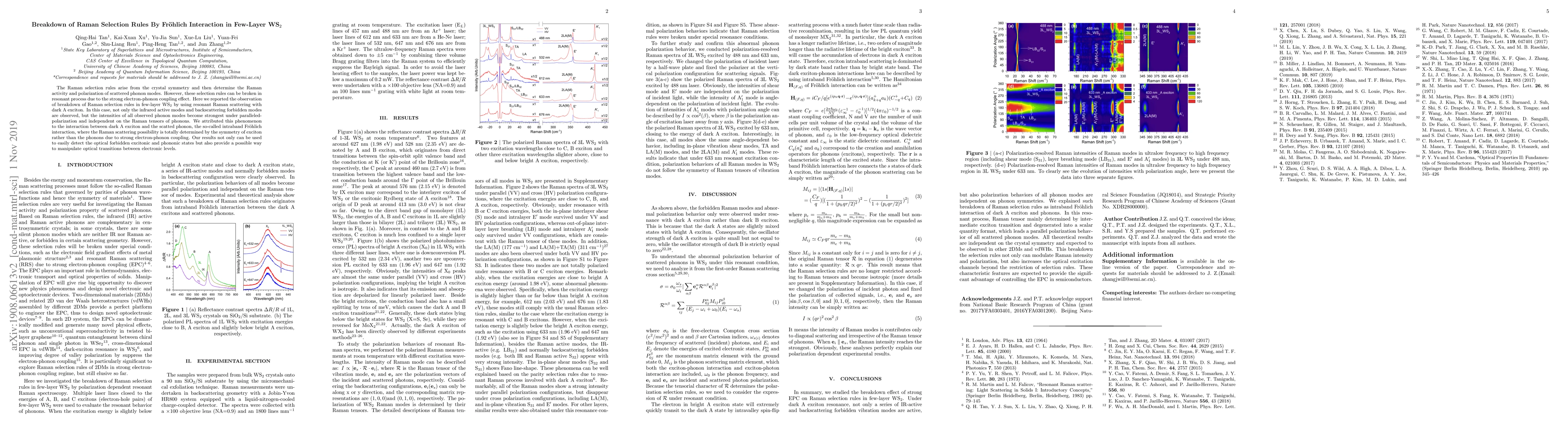 This paper reports the breakdown of Raman selection rules in few-layer WS$_2$ due to strong electron-phonon coupling via resonant Raman scattering, revealing unexpected phonon modes and polarization independence. The phenomenon is attributed to the intraband Fröhlich interaction between dark A excitons and scattered phonons.