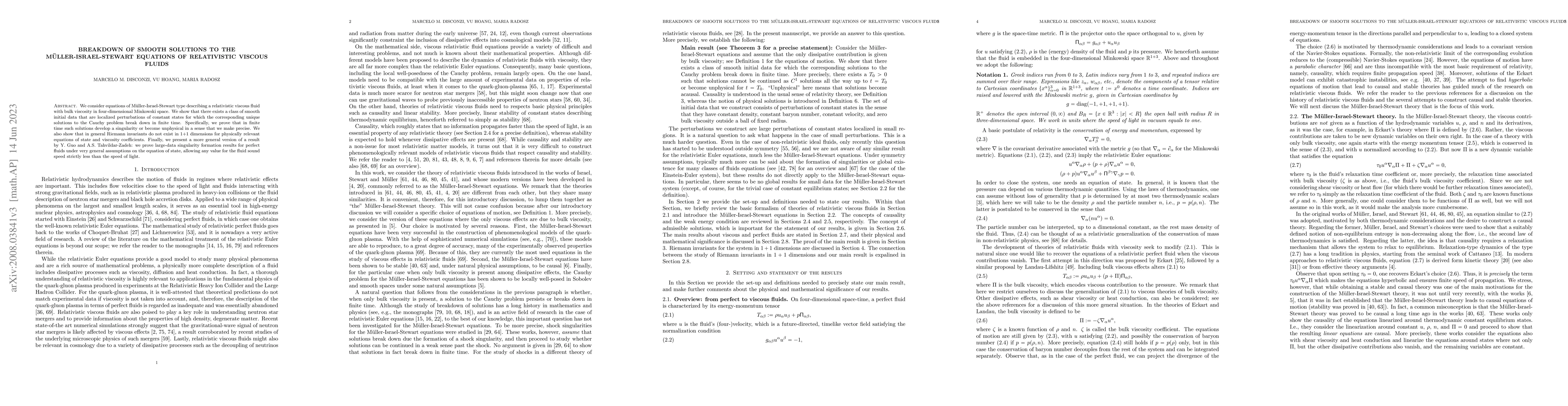 This paper investigates the breakdown of smooth solutions to the M\"uller-Israel-Stewart equations for relativistic viscous fluids, revealing that certain localized perturbations of constant states lead to finite-time singularity formation. It also demonstrates the absence of Riemann invariants in 1+1 dimensions and extends singularity results for perfect fluids under general equations of state.