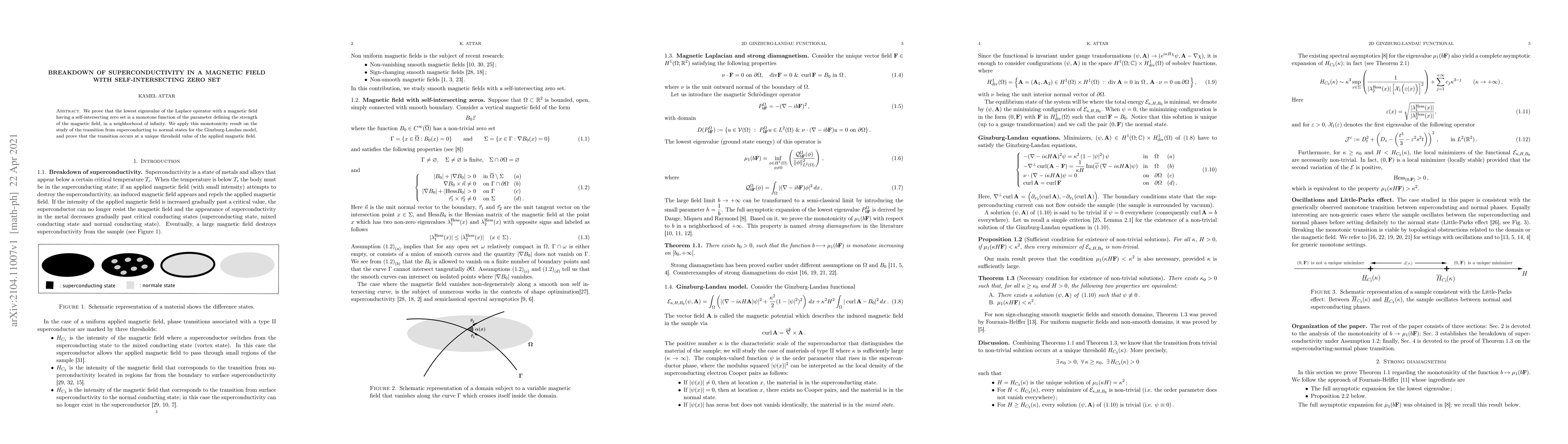 We prove that the lowest eigenvalue of the Laplace operator with a magnetic field having a self-intersecting zero set is a monotone function of the parameter defining the strength of the magnetic field, in a neighborhood of infinity. We apply this monotonicity result on the study of the transition from superconducting to normal states for the Ginzburg-Landau model, and prove that the transition occurs at a unique threshold value of the applied magnetic field.