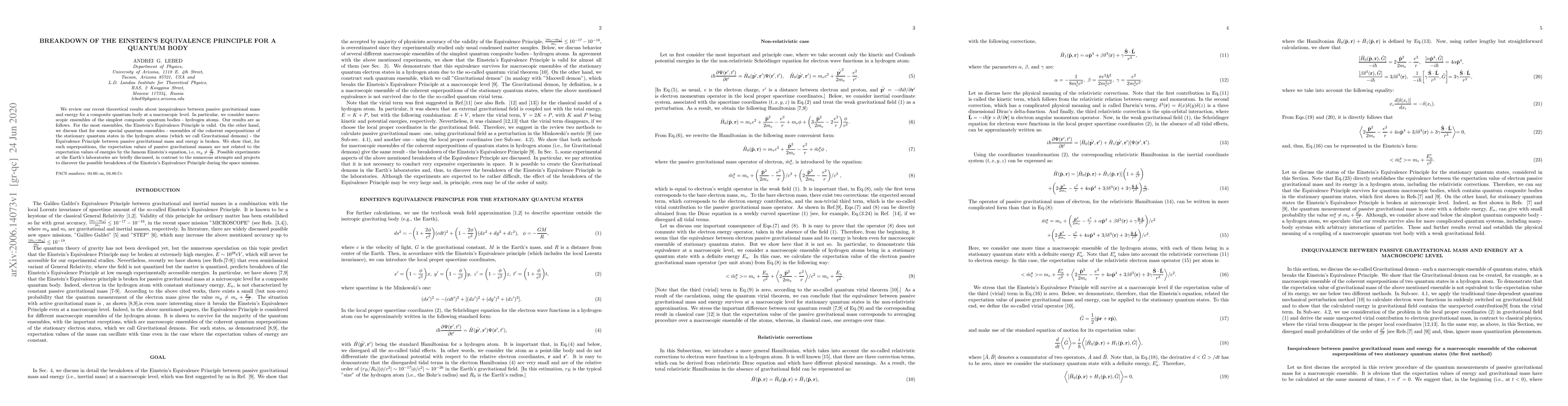 We review our recent theoretical results about inequivalence between passive gravitational mass and energy for a composite quantum body at a macroscopic level. In particular, we consider macroscopic ensembles of the simplest composite quantum bodies - hydrogen atoms. Our results are as follows. For the most ensembles, the Einstein's Equivalence Principle is valid. On the other hand, we discuss that for some special quantum ensembles - ensembles of the coherent superpositions of the stationary quantum states in the hydrogen atoms (which we call Gravitational demons) - the Equivalence Principle between passive gravitational mass and energy is broken. We show that, for such superpositions, the expectation values of passive gravitational masses are not related to the expectation values of energies by the famous Einstein's equation, i.e, $m_g \neq \frac{E}{c^2}$. Possible experiments at the Earth's laboratories are briefly discussed, in contrast to the numerous attempts and projects to discover the possible breakdown of the Einstein's Equivalence Principle during the space missions.