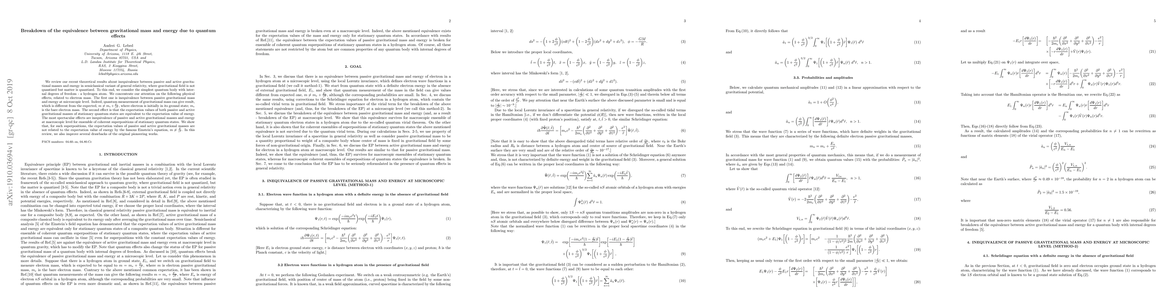 We review our recent theoretical results about inequivalence between passive and active gravitational masses and energy in semiclassical variant of general relativity, where gravitational field is not quantized but matter is quantized. To this end, we consider the simplest quantum body with internal degrees of freedom - a hydrogen atom. We concentrate our attention on the following physical effects, related to electron mass. The first one is inequivalence between passive gravitational mass and energy at microscopic level. Indeed, quantum measurement of gravitational mass can give result, which is different from the expected, $m \neq m_e + \frac{E_1}{c^2}$, where electron is initially in its ground state; $m_e$ is the bare electron mass. The second effect is that the expectation values of both passive and active gravitational masses of stationary quantum states are equivalent to the expectation value of energy. The most spectacular effects are inequivalence of passive and active gravitational masses and energy at macroscopic level for ensemble of coherent superpositions of stationary quantum states. We show that, for such superpositions, the expectation values of passive and active gravitational masses are not related to the expectation value of energy by the famous Einstein's equation, $m \neq \frac{E}{c^2}$. In this review, we also improve several drawbacks of the original pioneering works.