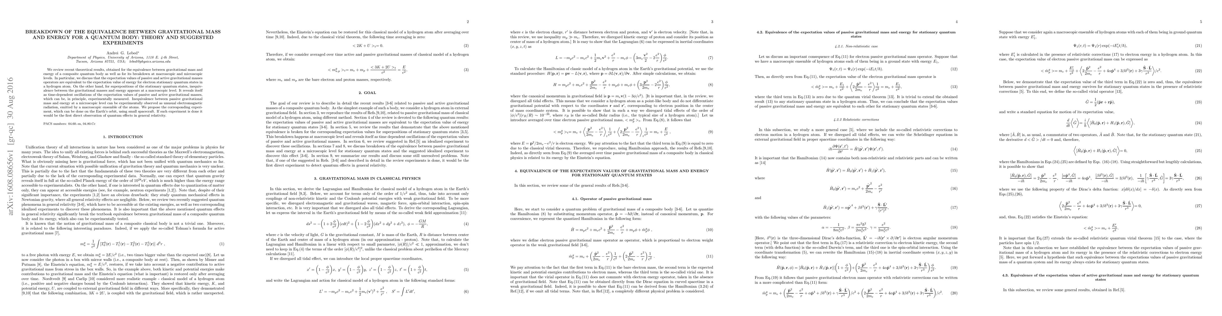 The paper discusses the breakdown of gravitational mass-energy equivalence for quantum bodies, revealing discrepancies in expectation values of gravitational mass and energy operators for superposition states at macroscopic levels. Time-dependent oscillations of these values are proposed as experimental evidence, suggestible via spacecraft experiments on Earth's orbit. Microscopic inequivalence is also proposed to be observable as unusual EM radiation from atomic ensembles, potentially offering the first direct observation of quantum effects in general relativity.