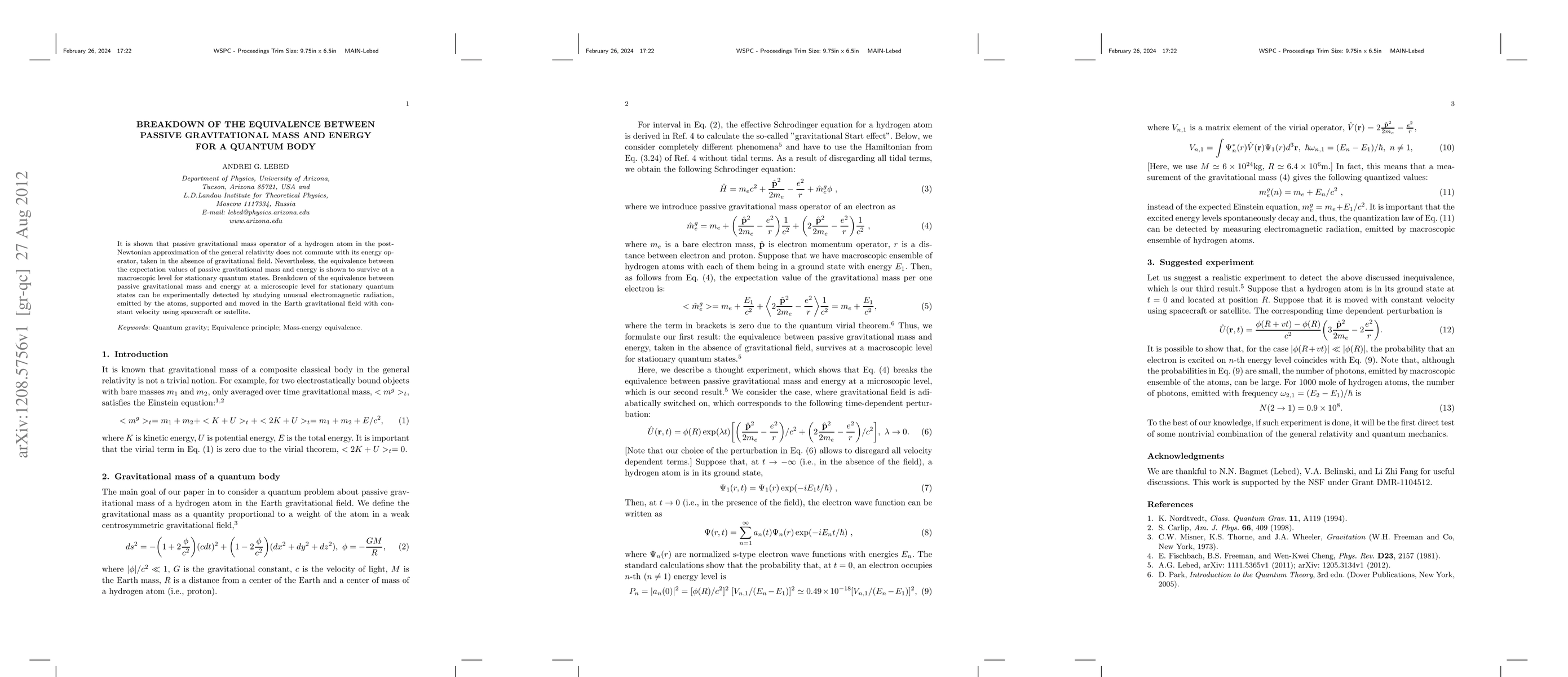 It is shown that passive gravitational mass operator of a hydrogen atom in the post-Newtonian approximation of the general relativity does not commute with its energy operator, taken in the absence of gravitational field. Nevertheless, the equivalence between the expectation values of passive gravitational mass and energy is shown to survive at a macroscopic level for stationary quantum states. Breakdown of the equivalence between passive gravitational mass and energy at a microscopic level for stationary quantum states can be experimentally detected by studying unusual electromagnetic radiation, emitted by the atoms, supported and moved in the Earth gravitational field with constant velocity using spacecraft or satellite.