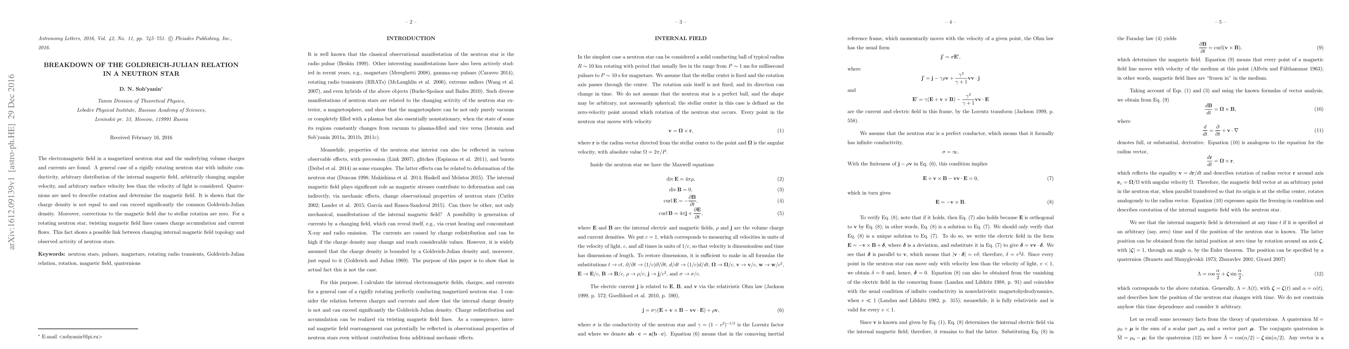 The electromagnetic field in a magnetized neutron star and the underlying volume charges and currents are found. A general case of a rigidly rotating neutron star with infinite conductivity, arbitrary distribution of the internal magnetic field, arbitrarily changing angular velocity, and arbitrary surface velocity less than the velocity of light is considered. Quaternions are used to describe rotation and determine the magnetic field. It is shown that the charge density is not equal to and can exceed significantly the common Goldreich-Julian density. Moreover, corrections to the magnetic field due to stellar rotation are zero. For a rotating neutron star, twisting magnetic field lines causes charge accumulation and current flows. This fact shows a possible link between changing internal magnetic field topology and observed activity of neutron stars.