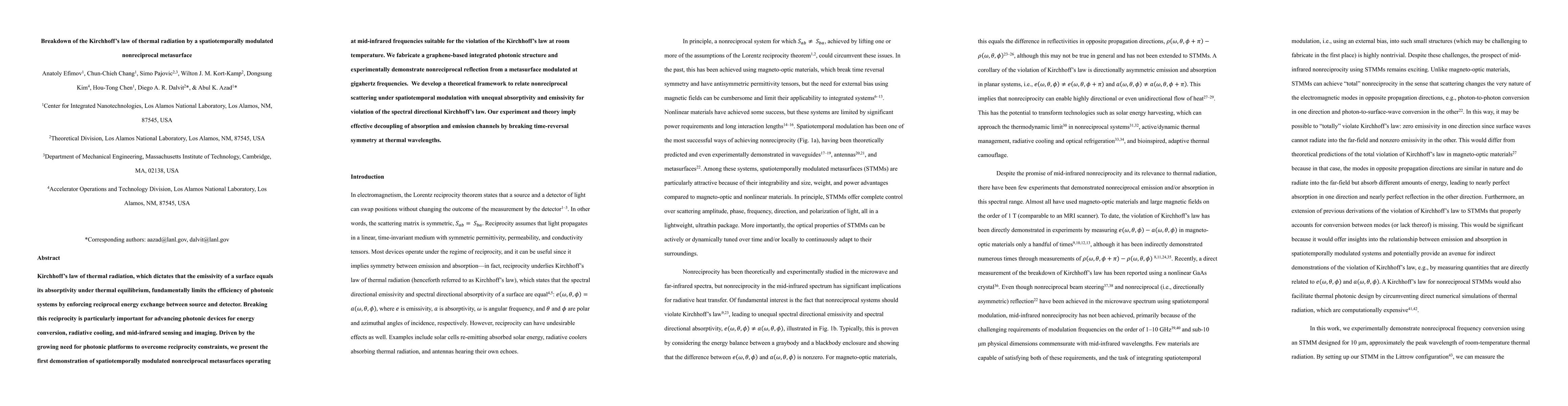 Kirchhoff's law of thermal radiation, which dictates that the emissivity of a surface equals its absorptivity under thermal equilibrium, which dictates that the emissivity of a surface equals its absorptivity under thermal equilibrium, fundamentally limits the efficiency of photonic systems by enforcing reciprocal energy exchange between source and detector. Breaking this reciprocity is particularly important for advancing photonic devices for energy conversion, radiative cooling, and mid-infrared sensing and imaging. Driven by the growing need for photonic platforms to overcome reciprocity constraints, we present the first demonstration of spatiotemporally modulated nonreciprocal metasurfaces operating at mid-infrared frequencies suitable for the violation of the Kirchhoff's law at room temperature. We fabricate a graphene-based integrated photonic structure and experimentally demonstrate nonreciprocal reflection from a metasurface modulated at gigahertz frequencies. We develop a theoretical framework to relate nonreciprocal scattering under spatiotemporal modulation with unequal absorptivity and emissivity for violation of the spectral directional Kirchhoff's law. Our experiment and theory imply effective decoupling of absorption and emission channels by breaking time-reversal symmetry at thermal wavelengths.