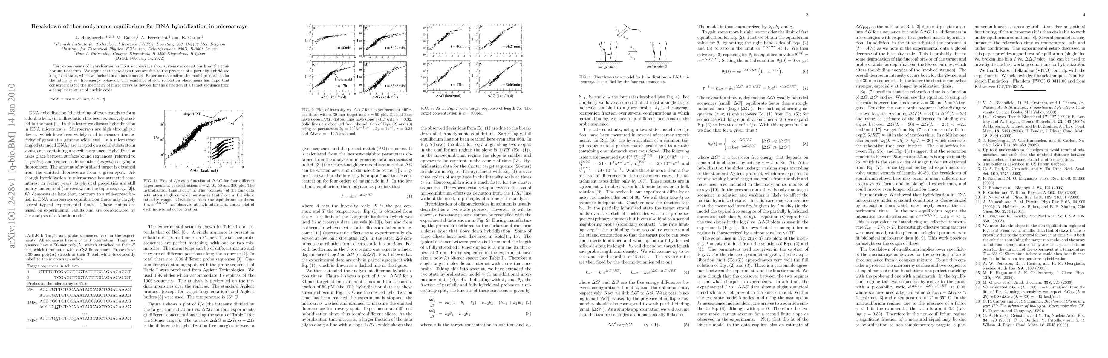 This paper investigates deviations from thermodynamic equilibrium in DNA hybridization on microarrays, attributing them to a long-lived partially hybridized state. A kinetic model incorporating this state accurately predicts experimental observations, highlighting the impact of slow relaxation phenomena on microarray specificity.