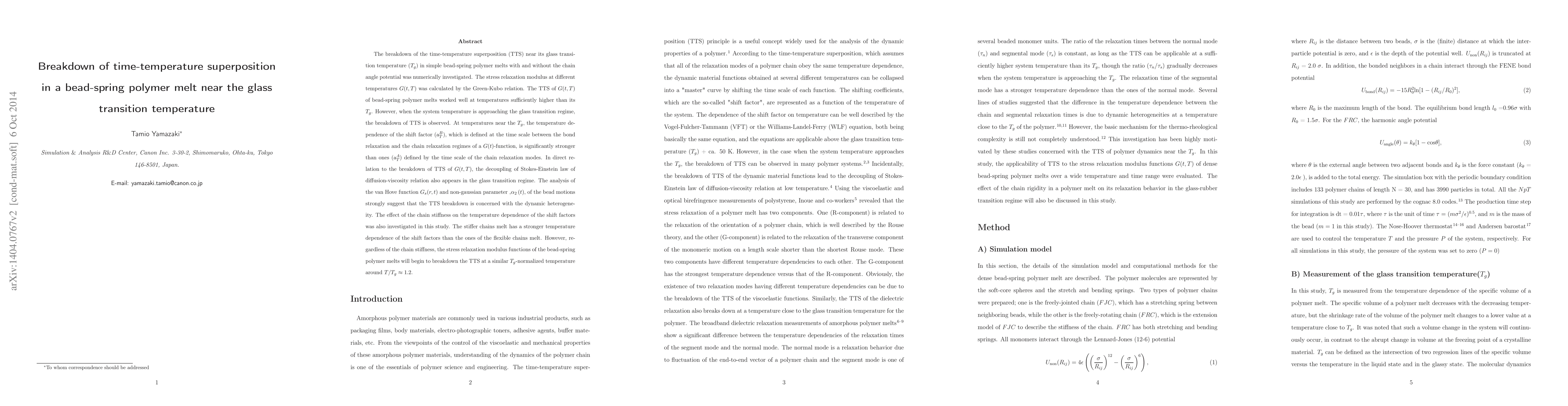The breakdown of the time-temperature superposition (TTS) near its glass transition temperature (Tg) in simple bead-spring polymer melts with and without the chain angle potential was numerically investigated. The stress relaxation modulus at different temperatures G(t,T) was calculated by the Green-Kubo relation. The TTS of G(t,T) of bead-spring polymer melts worked well at temperatures sufficiently higher than its Tg. However, when the system temperature is approaching the glass transition regime, the breakdown of TTS is observed. At temperatures near the Tg, the temperature dependence of the shift factor aTB, which is defined at the time scale between the bond relaxation and the chain relaxation regimes of a G(t)-function, is significantly stronger than ones aTA defined by the time scale of the chain relaxation modes. In direct relation to the breakdown of TTS of G(t,T), the decoupling of Stokes-Einstein law of diffusion-viscosity relation also appears in the glass transition regime. The analysis of the van Hove function Gs(r,t) and non-gaussian parameter, a2(t), of the bead motions strongly suggest that the TTS breakdown is concerned with the dynamic heterogeneity. The effect of the chain stiffness on the temperature dependence of the shift factors was also investigated in this study. The stiffer chains melt has a stronger temperature dependence of the shift factors than the ones of the flexible chains melt. However, regardless of the chain stiffness, the stress relaxation modulus functions of the bead-spring polymer melts will begin to breakdown the TTS at a similar Tg-normalized temperature around T/Tg ~ 1.2.