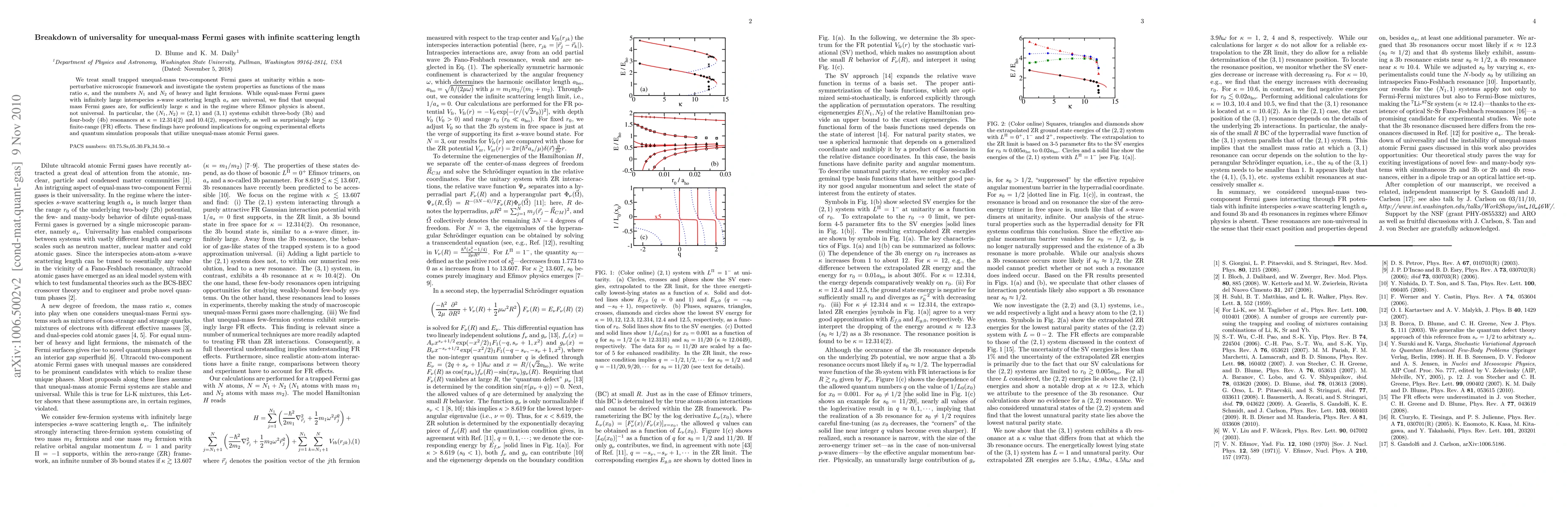 We treat small trapped unequal-mass two-component Fermi gases at unitarity within a non-perturbative microscopic framework and investigate the system properties as functions of the mass ratio $\kappa$, and the numbers $N_{1}$ and $N_2$ of heavy and light fermions. While equal-mass Fermi gases with infinitely large interspecies s-wave scattering length $a_s$ are universal, we find that unequal mass Fermi gases are, for sufficiently large $\kappa$ and in the regime where Efimov physics is absent, not universal. In particular, the $(N_1,N_2)=(2,1)$ and $(3,1)$ systems exhibit three-body (3b) and four-body (4b) resonances at $\kappa = 12.314(2)$ and $10.4(2)$, respectively, as well as surprisingly large finite-range (FR) effects. These findings have profound implications for ongoing experimental efforts and quantum simulation proposals that utilize unequal-mass atomic Fermi gases.