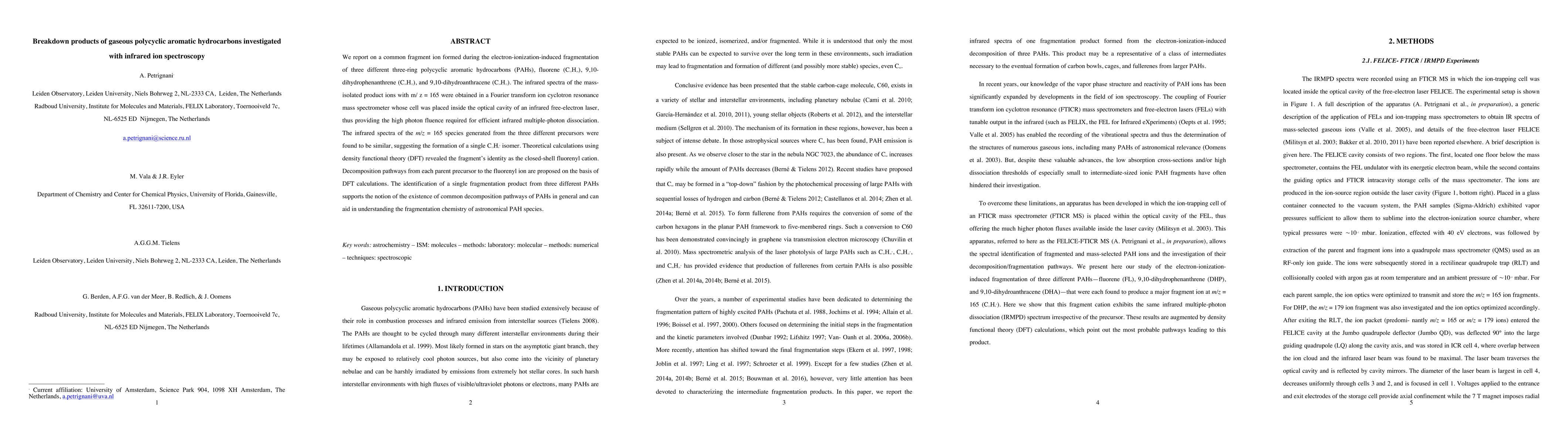 This study identifies a common fragment ion (m/z=165) formed during electron-ionization of three different three-ring PAHs (fluorene, 9,10-dihydrophenanthrene, and 9,10-dihydroanthracene) using infrared ion spectroscopy. The ion spectra suggest a single C13H9+ isomer, confirmed as the fluorenyl cation via DFT calculations. The findings indicate common decomposition pathways for PAHs, aiding understanding of astronomical PAH fragmentation chemistry.