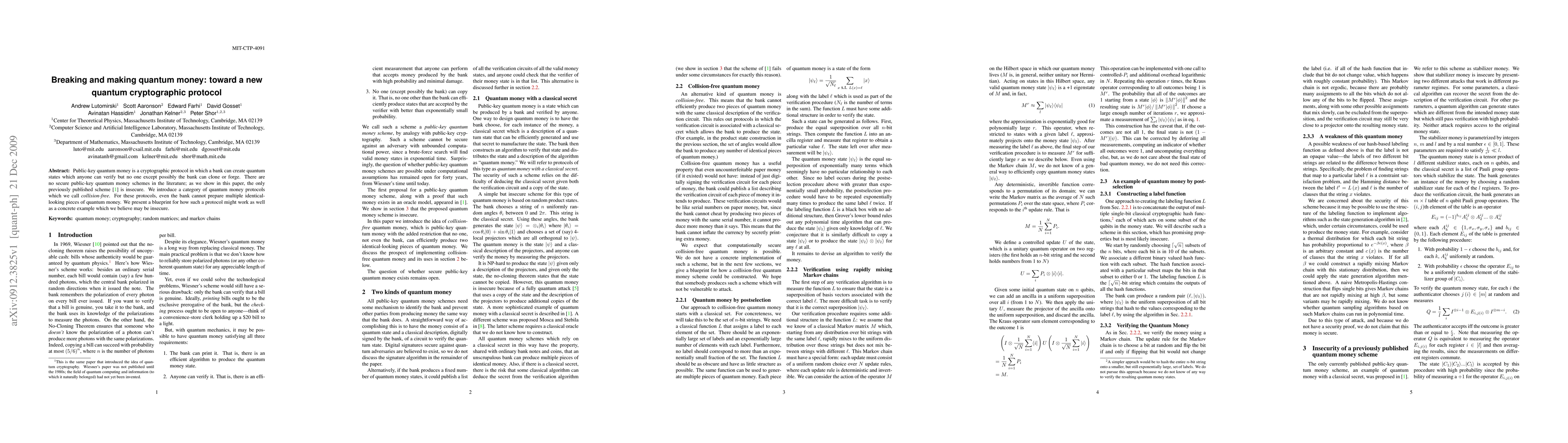 This paper discusses the development of a new category of quantum money protocols called collision-free, where even the bank cannot create identical-looking quantum money pieces. It identifies existing schemes as insecure and proposes a blueprint for a potentially insecure concrete example.