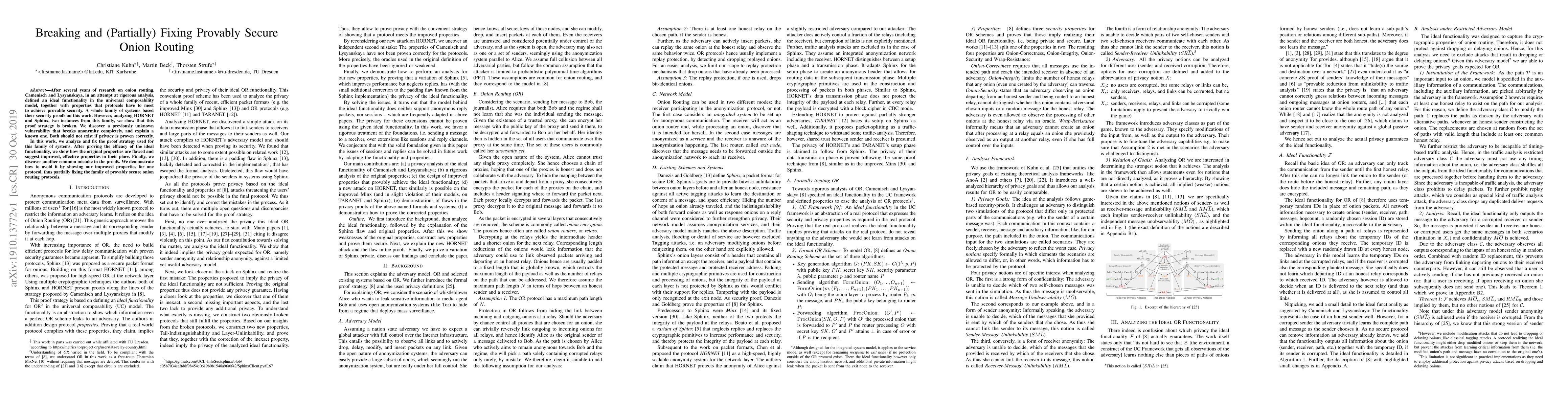 After several years of research on onion routing, Camenisch and Lysyanskaya, in an attempt at rigorous analysis, defined an ideal functionality in the universal composability model, together with properties that protocols have to meet to achieve provable security. A whole family of systems based their security proofs on this work. However, analyzing HORNET and Sphinx, two instances from this family, we show that this proof strategy is broken. We discover a previously unknown vulnerability that breaks anonymity completely, and explain a known one. Both should not exist if privacy is proven correctly. In this work, we analyze and fix the proof strategy used for this family of systems. After proving the efficacy of the ideal functionality, we show how the original properties are flawed and suggest improved, effective properties in their place. Finally, we discover another common mistake in the proofs. We demonstrate how to avoid it by showing our improved properties for one protocol, thus partially fixing the family of provably secure onion routing protocols.