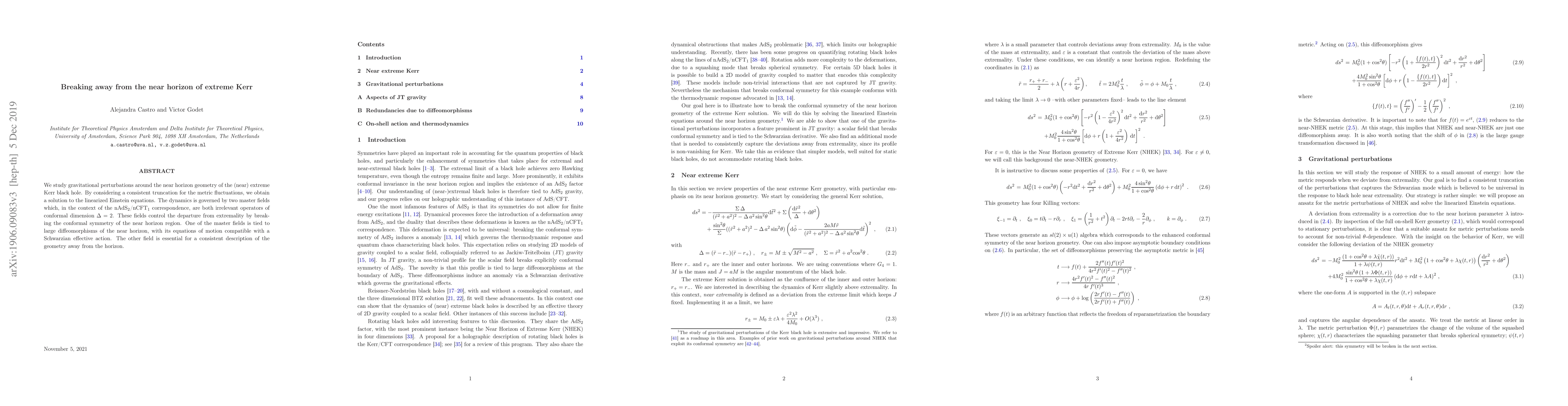 We study gravitational perturbations around the near horizon geometry of the (near) extreme Kerr black hole. By considering a consistent truncation for the metric fluctuations, we obtain a solution to the linearized Einstein equations. The dynamics is governed by two master fields which, in the context of the nAdS$_2$/nCFT$_1$ correspondence, are both irrelevant operators of conformal dimension $\Delta=2$. These fields control the departure from extremality by breaking the conformal symmetry of the near horizon region. One of the master fields is tied to large diffeomorphisms of the near horizon, with its equations of motion compatible with a Schwarzian effective action. The other field is essential for a consistent description of the geometry away from the horizon.