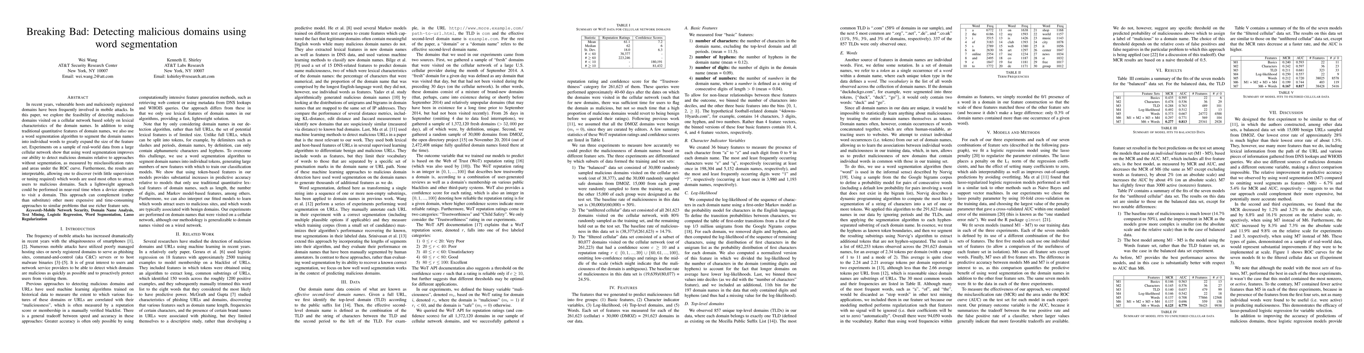 In recent years, vulnerable hosts and maliciously registered domains have been frequently involved in mobile attacks. In this paper, we explore the feasibility of detecting malicious domains visited on a cellular network based solely on lexical characteristics of the domain names. In addition to using traditional quantitative features of domain names, we also use a word segmentation algorithm to segment the domain names into individual words to greatly expand the size of the feature set. Experiments on a sample of real-world data from a large cellular network show that using word segmentation improves our ability to detect malicious domains relative to approaches without segmentation, as measured by misclassification rates and areas under the ROC curve. Furthermore, the results are interpretable, allowing one to discover (with little supervision or tuning required) which words are used most often to attract users to malicious domains. Such a lightweight approach could be performed in near-real time when a device attempts to visit a domain. This approach can complement (rather than substitute) other more expensive and time-consuming approaches to similar problems that use richer feature sets.
