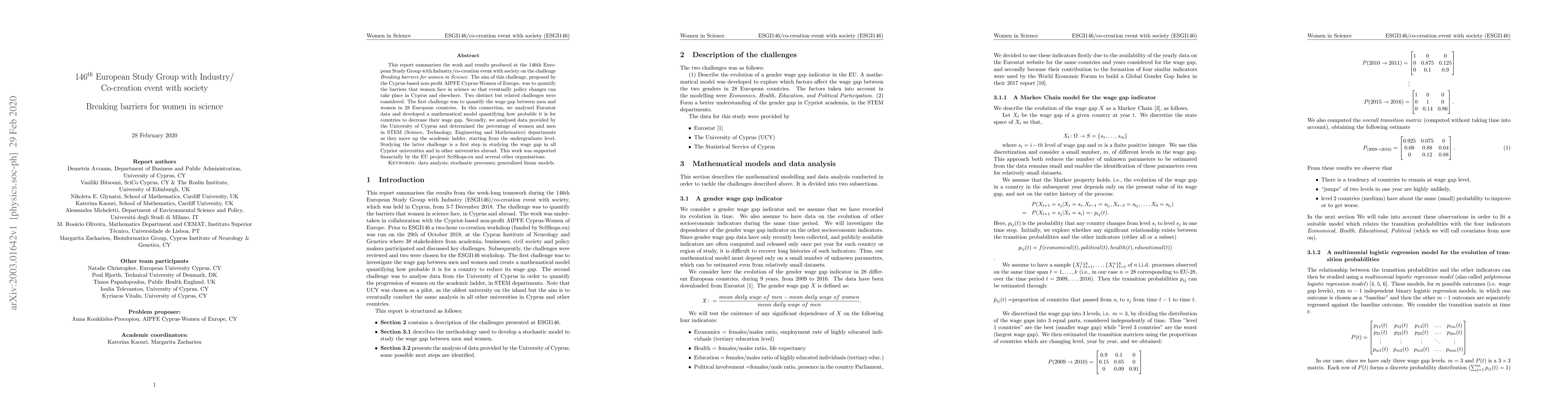 This report summarises the work and results produced at the 146th European Study Group with Industry/co-creation event with society on the challenge \textit{Breaking barriers for women in Science}. The aim of this challenge, proposed by the Cyprus-based non-profit AIPFE Cyprus-Women of Europe, was to quantify the barriers that women face in science so that eventually policy changes can take place in Cyprus and elsewhere. Two distinct but related challenges were considered. The first challenge was to quantify the wage gap between men and women in 28 European countries. In this connection, we analysed Eurostat data and developed a mathematical model quantifying how probable it is for countries to decrease their wage gap. Secondly, we analysed data provided by the University of Cyprus and determined the percentage of women and men in STEM (Science, Technology, Engineering and Mathematics) departments as they move up the academic ladder, starting from the undergraduate level. Studying the latter challenge is a first step in studying the wage gap in all Cypriot universities and in other universities abroad. This work was supported financially by the EU project SciShops.eu, the EU Mathematics for Industry Network (MI-NET) and several other organisations.