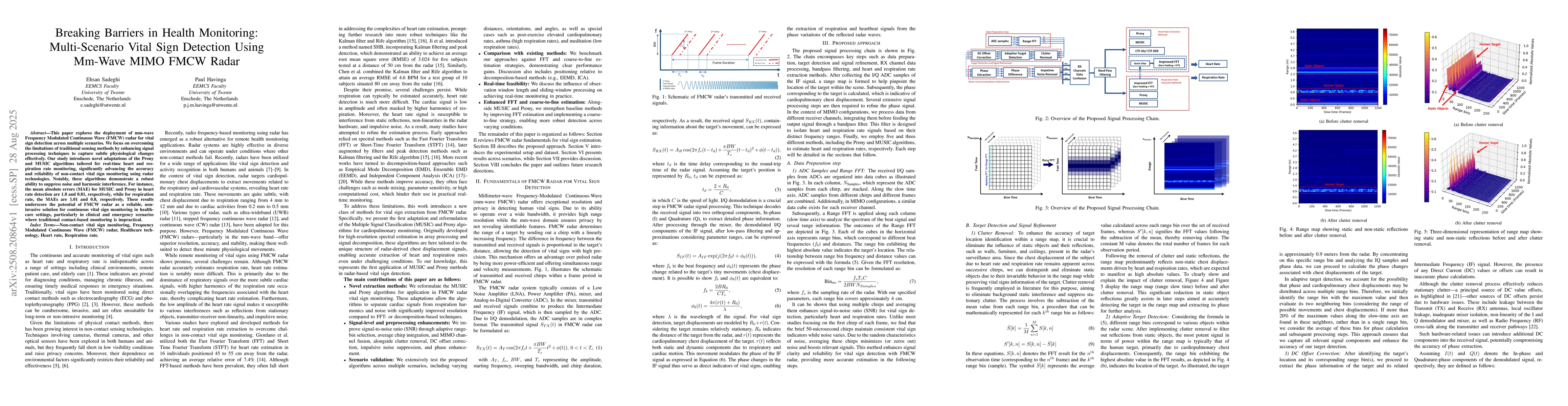 This paper explores the deployment of mm-wave Frequency Modulated Continuous Wave (FMCW) radar for vital sign detection across multiple scenarios. We focus on overcoming the limitations of traditional sensing methods by enhancing signal processing techniques to capture subtle physiological changes effectively. Our study introduces novel adaptations of the Prony and MUSIC algorithms tailored for real-time heart and respiration rate monitoring, significantly advancing the accuracy and reliability of non-contact vital sign monitoring using radar technologies. Notably, these algorithms demonstrate a robust ability to suppress noise and harmonic interference. For instance, the mean absolute errors (MAE) for MUSIC and Prony in heart rate detection are 1.8 and 0.81, respectively, while for respiration rate, the MAEs are 1.01 and 0.8, respectively. These results underscore the potential of FMCW radar as a reliable, non-invasive solution for continuous vital sign monitoring in healthcare settings, particularly in clinical and emergency scenarios where traditional contact-based monitoring is impractical.