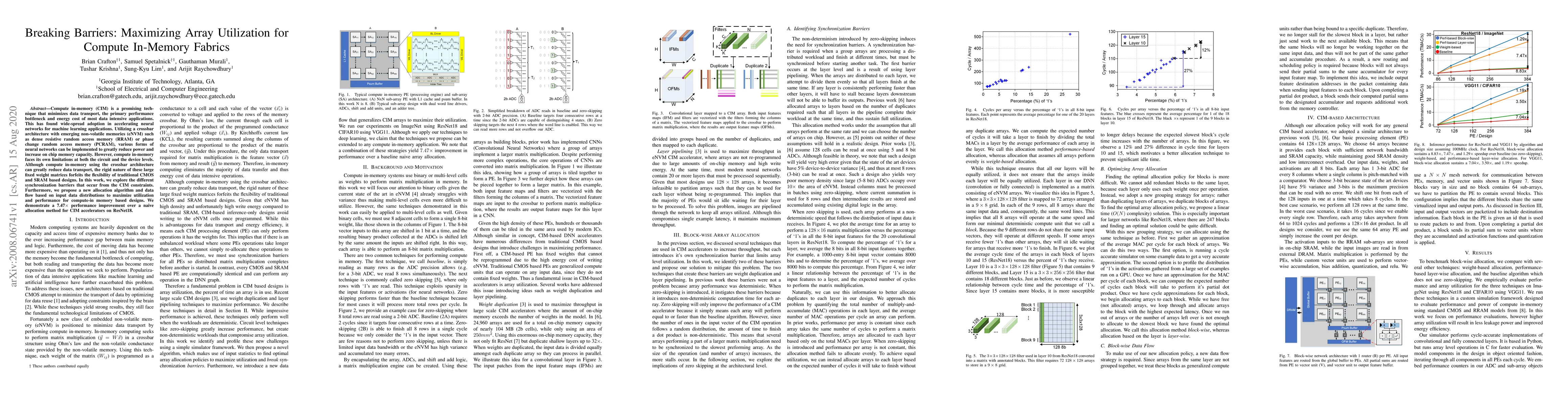 This paper explores the barriers to maximizing array utilization in compute in-memory (CIM) fabrics, proposing a new allocation algorithm and data flow method based on input data distributions to enhance performance. The study demonstrates a 7.47× performance improvement over a naive allocation method for CIM accelerators on ResNet18.