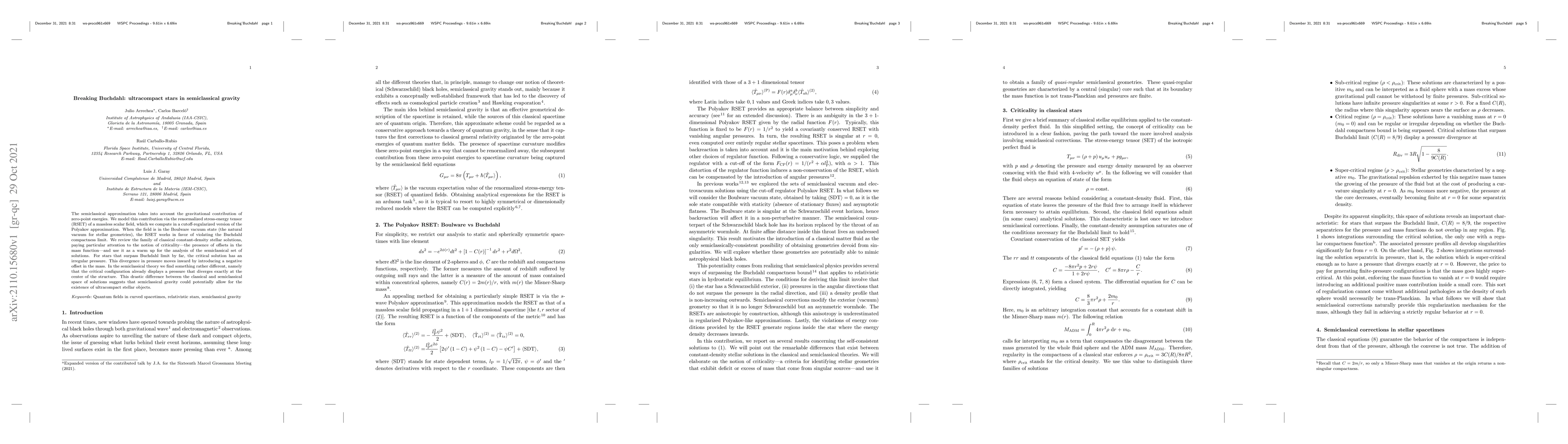 The semiclassical approximation takes into account the gravitational contribution of zero-point energies. We model this contribution via the renormalized stress-energy tensor (RSET) of a massless scalar field, which we compute in a cutoff-regularized version of the Polyakov approximation. When the field is in the Boulware vacuum state (the natural vacuum for stellar geometries), the RSET works in favor of violating the Buchdahl compactness limit. We review the family of classical constant-density stellar solutions, paying particular attention to the notion of criticality -- the presence of offsets in the mass function -- and use it as a warm up for the analysis of the semiclassical set of solutions. For stars that surpass Buchdahl limit by far, the critical solution has an irregular pressure. This divergence in pressure moves inward by introducing a negative offset in the mass. In the semiclassical theory we find something rather different, namely that the critical configuration already displays a pressure that diverges exactly at the center of the structure. This drastic difference between the classical and semiclassical space of solutions suggests that semiclassical gravity could potentially allow for the existence of ultracompact stellar objects.