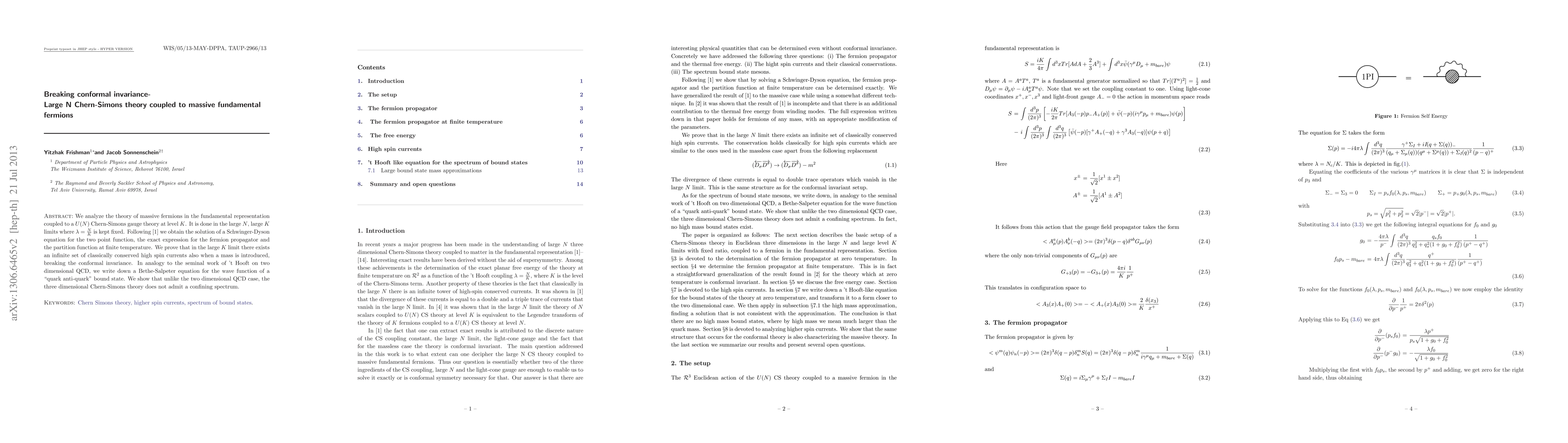 This paper investigates a U(N) Chern-Simons theory coupled to massive fermions in large N, large K limits, deriving the fermion propagator and partition function. It reveals the existence of high spin currents in the large K limit, breaking conformal invariance, and demonstrates that unlike two-dimensional QCD, the three-dimensional theory does not support a confining spectrum.