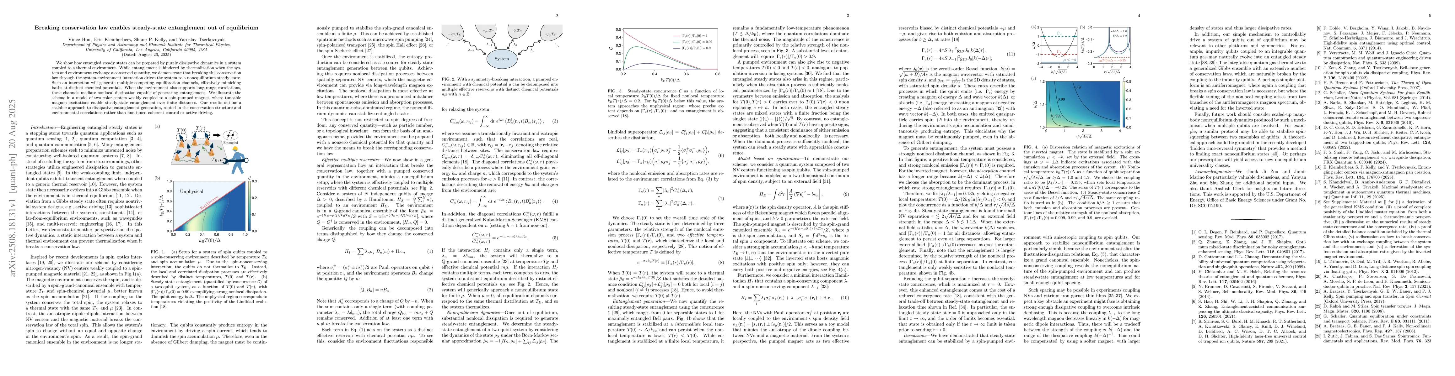 We show how entangled steady states can be prepared by purely dissipative dynamics in a system coupled to a thermal environment. While entanglement is hindered by thermalization when the system and environment exchange a conserved quantity, we demonstrate that breaking this conservation law through the system-environment interaction drives the system to a nonequilibrium steady state. Such an interaction will generate multiple competing equilibration channels, effectively mimicking baths at distinct chemical potentials. When the environment also supports long-range correlations, these channels mediate nonlocal dissipation capable of generating entanglement. We illustrate the scheme in a model of two color centers weakly coupled to a spin-pumped magnet, where tuneable magnon excitations enable steady-state entanglement over finite distances. Our results outline a scalable approach to dissipative entanglement generation, rooted in the conservation structure and environmental correlations rather than fine-tuned coherent control or active driving.
