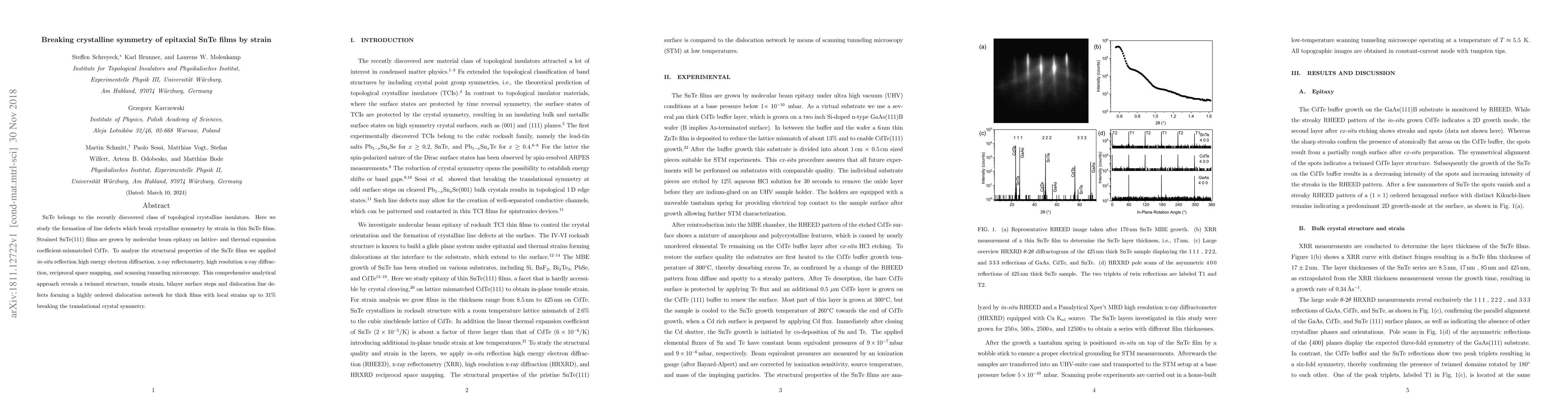 This study investigates how strain in SnTe films, grown epitaxially on CdTe substrates, creates line defects that break crystalline symmetry. The research employs various analytical techniques to reveal a twinned structure, tensile strain, and a highly ordered dislocation network, with local strains up to 31% causing significant symmetry breaking in thick films.