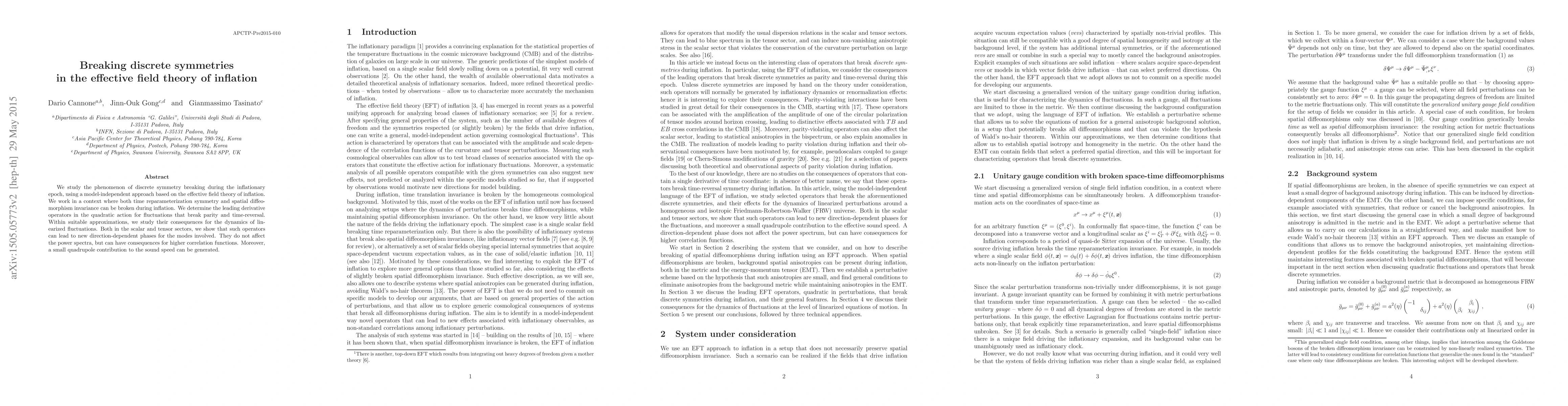 We study the phenomenon of discrete symmetry breaking during the inflationary epoch, using a model-independent approach based on the effective field theory of inflation. We work in a context where both time reparameterization symmetry and spatial diffeomorphism invariance can be broken during inflation. We determine the leading derivative operators in the quadratic action for fluctuations that break parity and time-reversal. Within suitable approximations, we study their consequences for the dynamics of linearized fluctuations. Both in the scalar and tensor sectors, we show that such operators can lead to new direction-dependent phases for the modes involved. They do not affect the power spectra, but can have consequences for higher correlation functions. Moreover, a small quadrupole contribution to the sound speed can be generated.