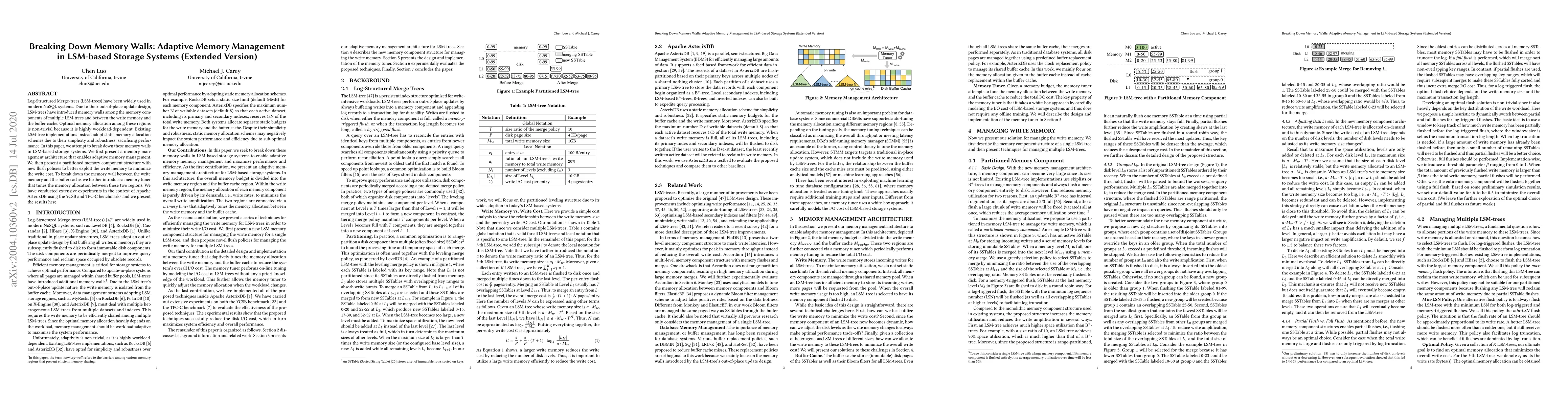 This paper proposes an adaptive memory management architecture for LSM-based storage systems to overcome memory wall issues caused by static memory allocation. It introduces a partitioned memory structure with optimized flush policies and a memory tuner to dynamically allocate memory between write memory and buffer cache, achieving better performance.