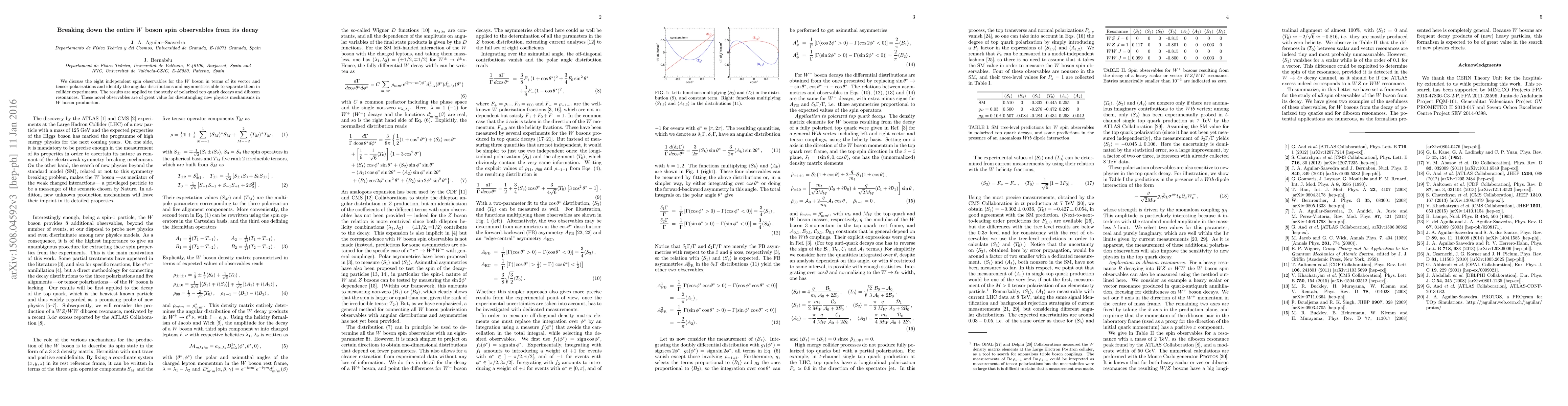 We discuss the eight independent spin observables for the $W$ boson in terms of its vector and tensor polarizations and identify the angular distributions and asymmetries able to separate them in collider experiments. The results are applied to the study of polarized top quark decays and diboson resonances. These novel observables are of great value for disentangling new physics mechanisms in $W$ boson production.