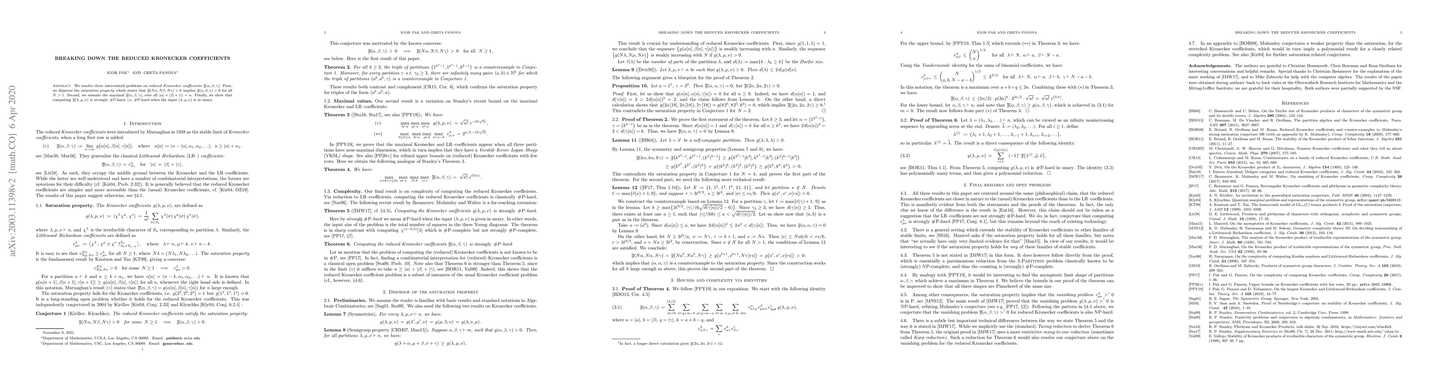 This paper resolves three key problems related to reduced Kronecker coefficients, including disproof of a saturation property and estimation of maximal values, while also showing that computing these coefficients is strongly #P-hard.