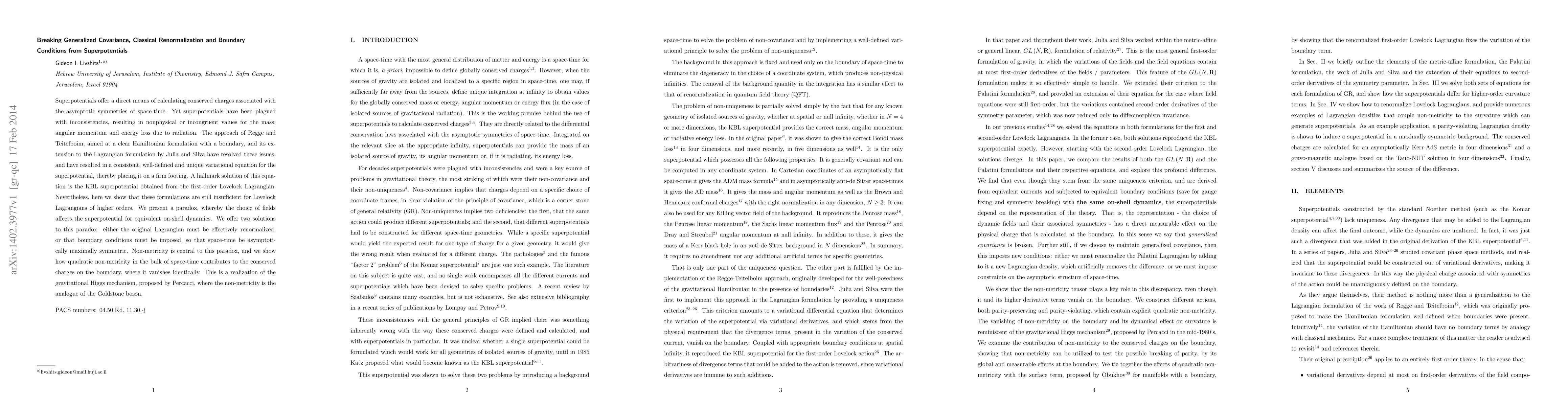 Superpotentials offer a direct means of calculating conserved charges associated with the asymptotic symmetries of space-time. Yet superpotentials have been plagued with inconsistencies, resulting in nonphysical or incongruent values for the mass, angular momentum and energy loss due to radiation. The approach of Regge and Teitelboim, aimed at a clear Hamiltonian formulation with a boundary, and its extension to the Lagrangian formulation by Julia and Silva have resolved these issues, and have resulted in a consistent, well-defined and unique variational equation for the superpotential, thereby placing it on a firm footing. A hallmark solution of this equation is the KBL superpotential obtained from the first-order Lovelock Lagrangian. Nevertheless, here we show that these formulations are still insufficient for Lovelock Lagrangians of higher orders. We present a paradox, whereby the choice of fields affects the superpotential for equivalent on-shell dynamics. We offer two solutions to this paradox: either the original Lagrangian must be effectively renormalized, or that boundary conditions must be imposed, so that space-time be asymptotically maximally symmetric. Non-metricity is central to this paradox, and we show how quadratic non-metricity in the bulk of space-time contributes to the conserved charges on the boundary, where it vanishes identically. This is a realization of the gravitational Higgs mechanism, proposed by Percacci, where the non-metricity is the analogue of the Goldstone boson.