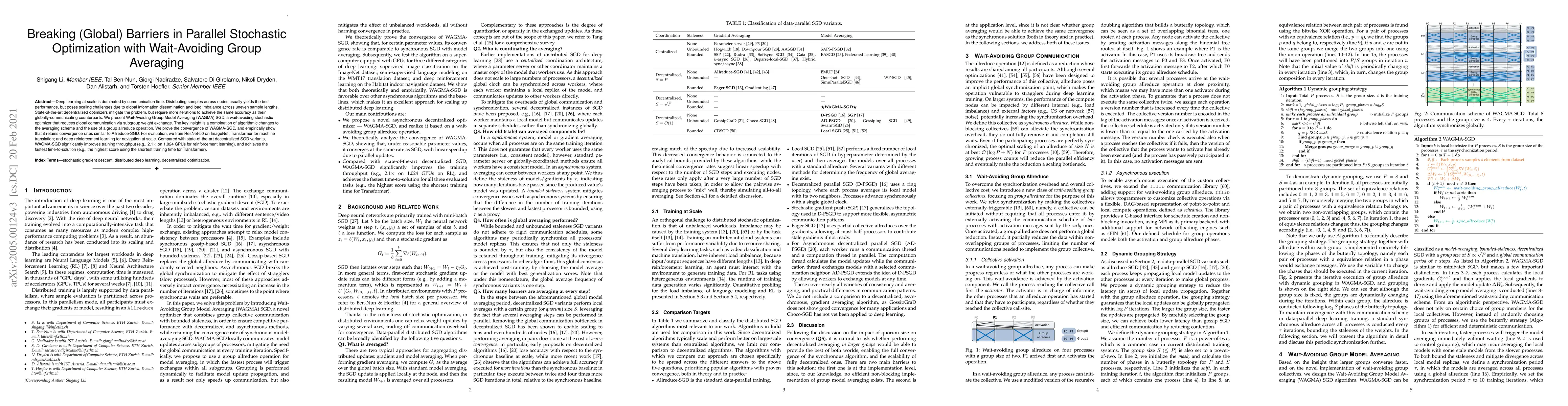 Deep learning at scale is dominated by communication time. Distributing samples across nodes usually yields the best performance, but poses scaling challenges due to global information dissemination and load imbalance across uneven sample lengths. State-of-the-art decentralized optimizers mitigate the problem, but require more iterations to achieve the same accuracy as their globally-communicating counterparts. We present Wait-Avoiding Group Model Averaging (WAGMA) SGD, a wait-avoiding stochastic optimizer that reduces global communication via subgroup weight exchange. The key insight is a combination of algorithmic changes to the averaging scheme and the use of a group allreduce operation. We prove the convergence of WAGMA-SGD, and empirically show that it retains convergence rates similar to Allreduce-SGD. For evaluation, we train ResNet-50 on ImageNet; Transformer for machine translation; and deep reinforcement learning for navigation at scale. Compared with state-of-the-art decentralized SGD variants, WAGMA-SGD significantly improves training throughput (e.g., 2.1x on 1,024 GPUs for reinforcement learning), and achieves the fastest time-to-solution (e.g., the highest score using the shortest training time for Transformer).