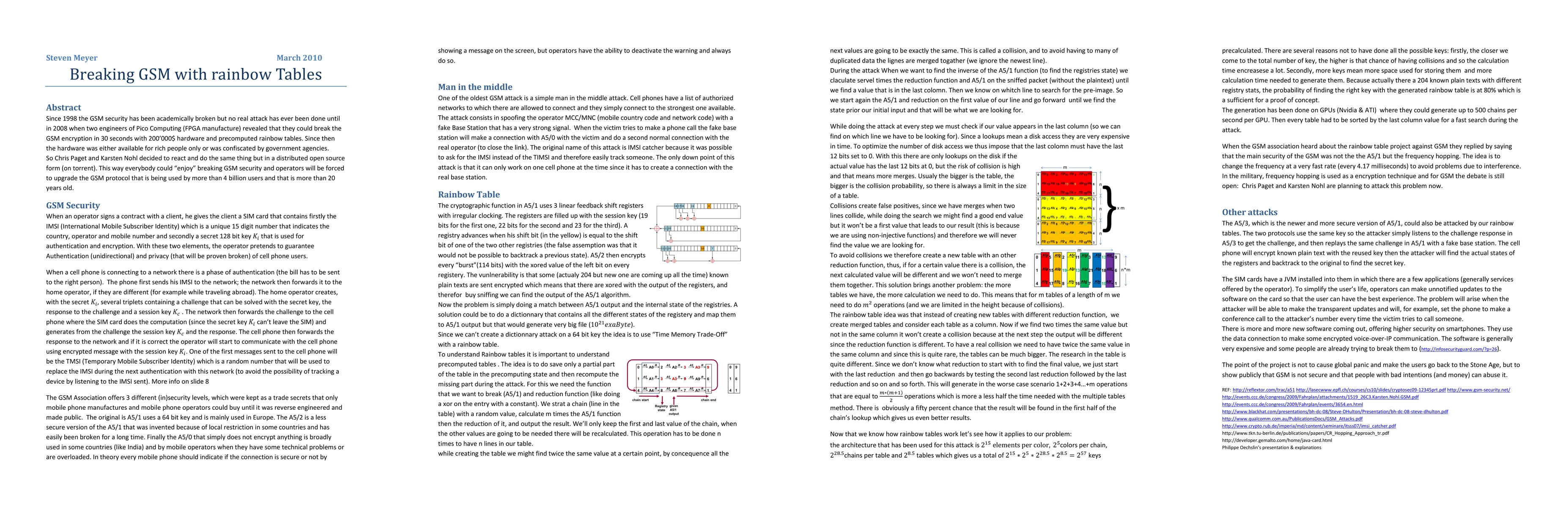 Summary: Researchers Chris Paget and Karsten Nohl developed a distributed, open-source method to break GSM encryption using precomputed rainbow tables, aiming to pressure operators to upgrade the outdated GSM protocol used by billions. This approach democratizes the attack previously limited to expensive hardware.