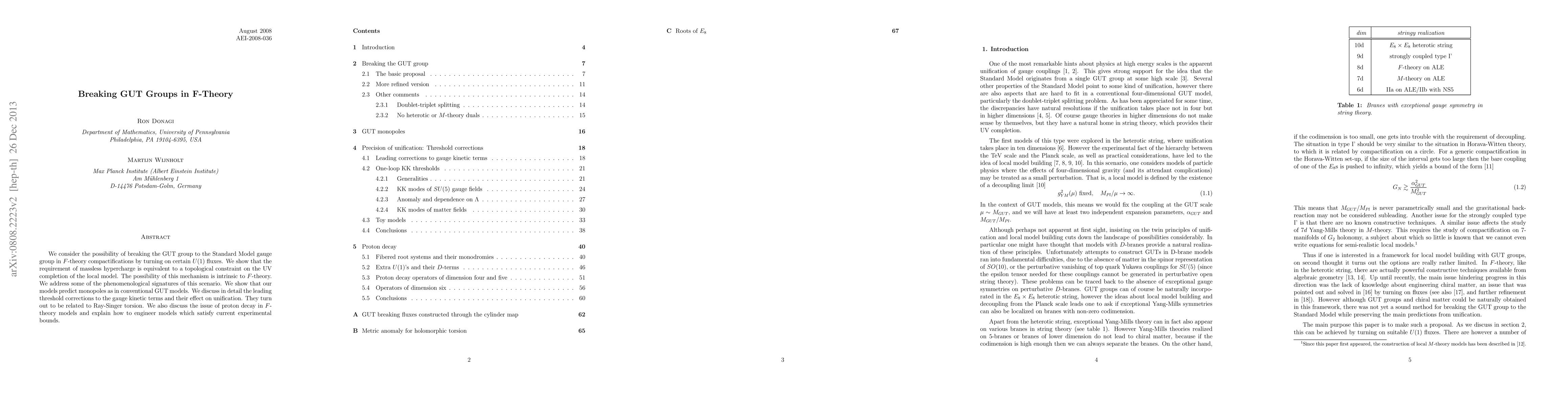This paper explores the breaking of Grand Unified Theory (GUT) groups in F-theory compactifications via U(1) fluxes, demonstrating that massless hypercharge correlates to a topological constraint. The study discusses phenomenological implications, including monopole predictions and gauge kinetic term corrections linked to Ray-Singer torsion, while addressing proton decay constraints to meet experimental standards.