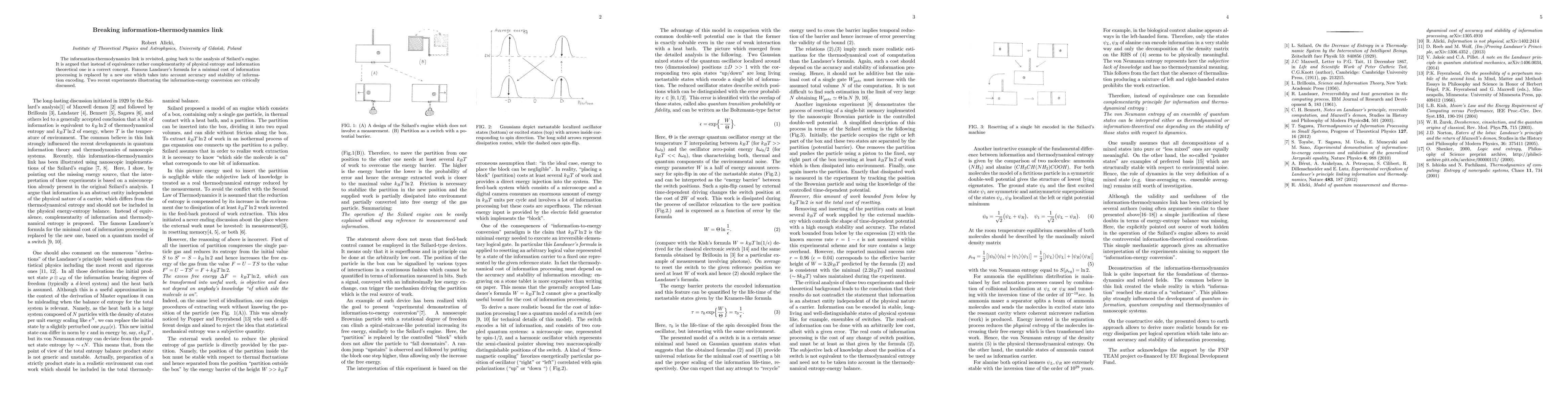 The information-thermodynamics link is revisited, going back to the analysis of Szilard's engine. It is argued that instead of equivalence rather complementarity of physical entropy and information theoretical one is a correct concept. Famous Landauer's formula for a minimal cost of information processing is replaced by a new one which takes into account accuracy and stability of information encoding. Two recent experiments illustrating the information-energy conversion are critically discussed.