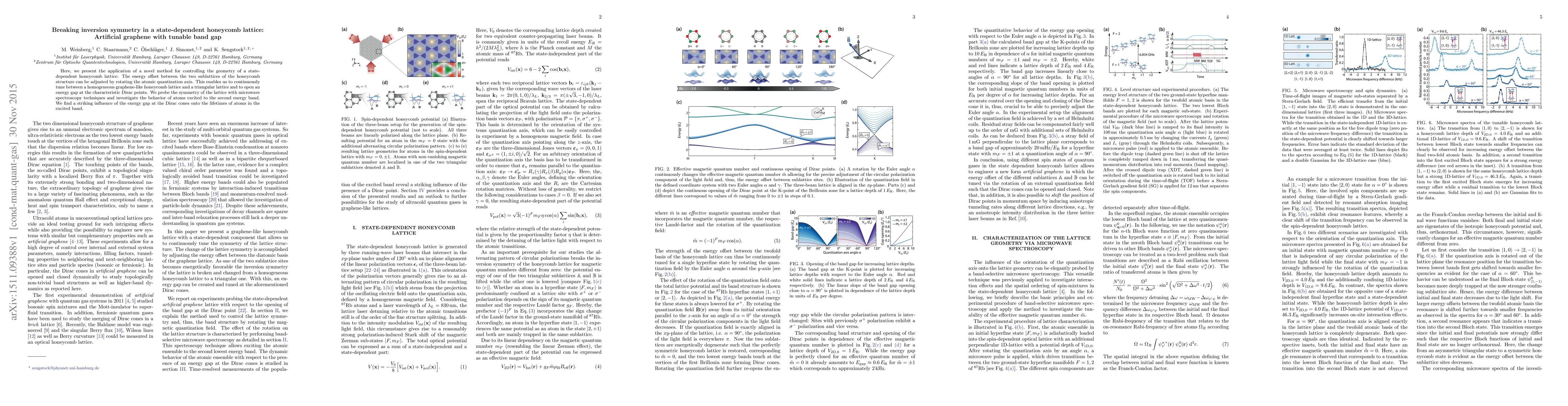 Here, we present the application of a novel method for controlling the geometry of a state-dependent honeycomb lattice: The energy offset between the two sublattices of the honeycomb structure can be adjusted by rotating the atomic quantization axis. This enables us to continuously tune between a homogeneous graphene-like honeycomb lattice and a triangular lattice and to open an energy gap at the characteristic Dirac points. We probe the symmetry of the lattice with microwave spectroscopy techniques and investigate the behavior of atoms excited to the second energy band. We find a striking influence of the energy gap at the Dirac cones onto the lifetimes of atoms in the excited band.