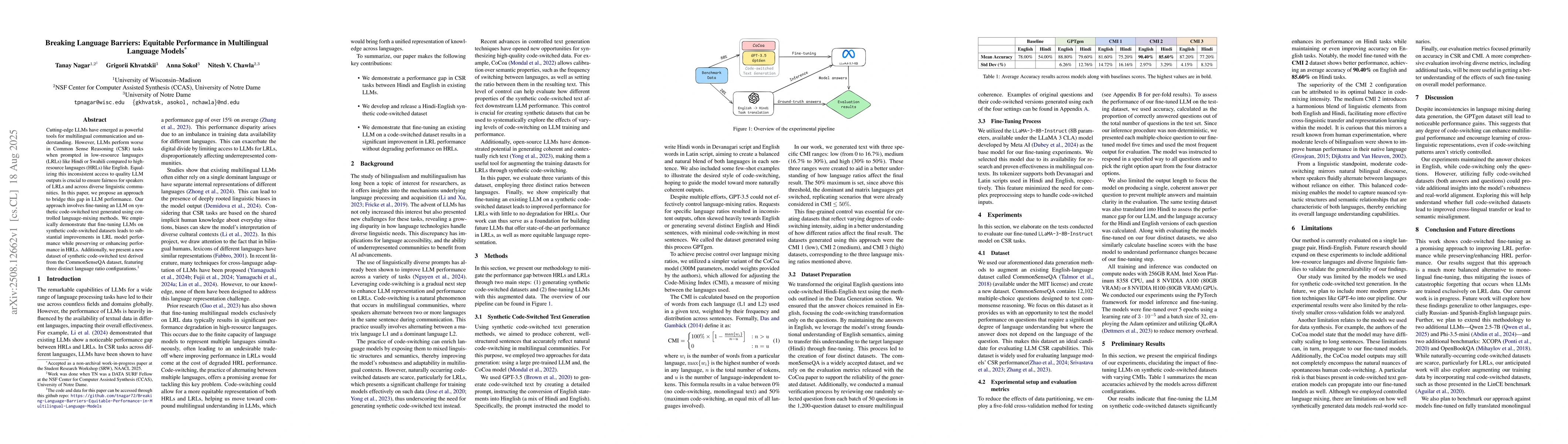 Cutting-edge LLMs have emerged as powerful tools for multilingual communication and understanding. However, LLMs perform worse in Common Sense Reasoning (CSR) tasks when prompted in low-resource languages (LRLs) like Hindi or Swahili compared to high-resource languages (HRLs) like English. Equalizing this inconsistent access to quality LLM outputs is crucial to ensure fairness for speakers of LRLs and across diverse linguistic communities. In this paper, we propose an approach to bridge this gap in LLM performance. Our approach involves fine-tuning an LLM on synthetic code-switched text generated using controlled language-mixing methods. We empirically demonstrate that fine-tuning LLMs on synthetic code-switched datasets leads to substantial improvements in LRL model performance while preserving or enhancing performance in HRLs. Additionally, we present a new dataset of synthetic code-switched text derived from the CommonSenseQA dataset, featuring three distinct language ratio configurations.