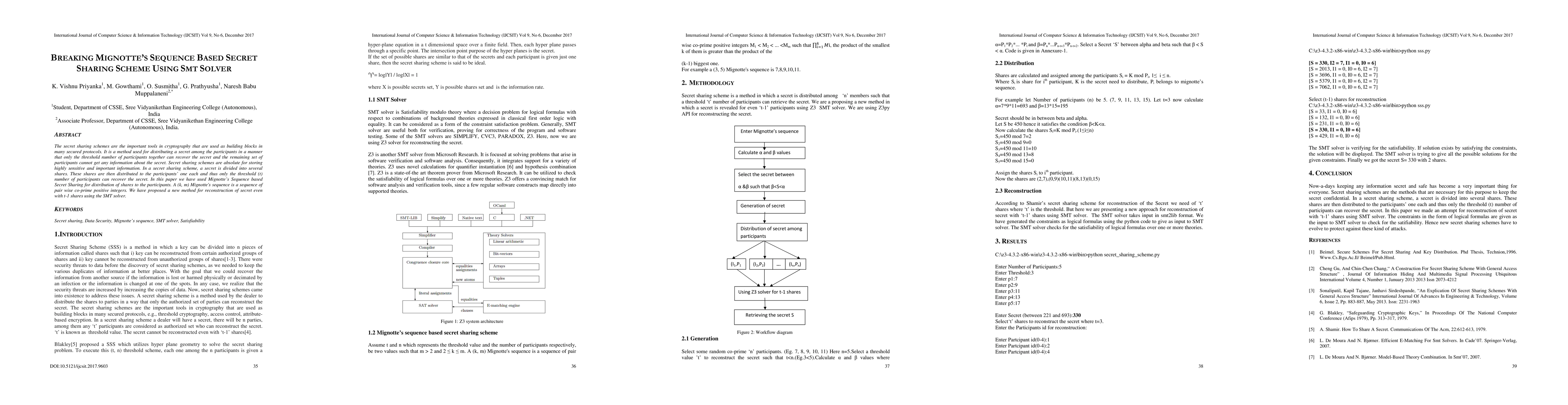 The secret sharing schemes are the important tools in cryptography that are used as building blocks in many secured protocols. It is a method used for distributing a secret among the participants in a manner that only the threshold number of participants together can recover the secret and the remaining set of participants cannot get any information about the secret. Secret sharing schemes are absolute for storing highly sensitive and important information. In a secret sharing scheme, a secret is divided into several shares. These shares are then distributed to the participants one each and thus only the threshold (t) number of participants can recover the secret. In this paper we have used Mignotte's Sequence based Secret Sharing for distribution of shares to the participants. A (k, m) Mignotte's sequence is a sequence of pair wise co-prime positive integers. We have proposed a new method for reconstruction of secret even with t-1 shares using the SMT solver.