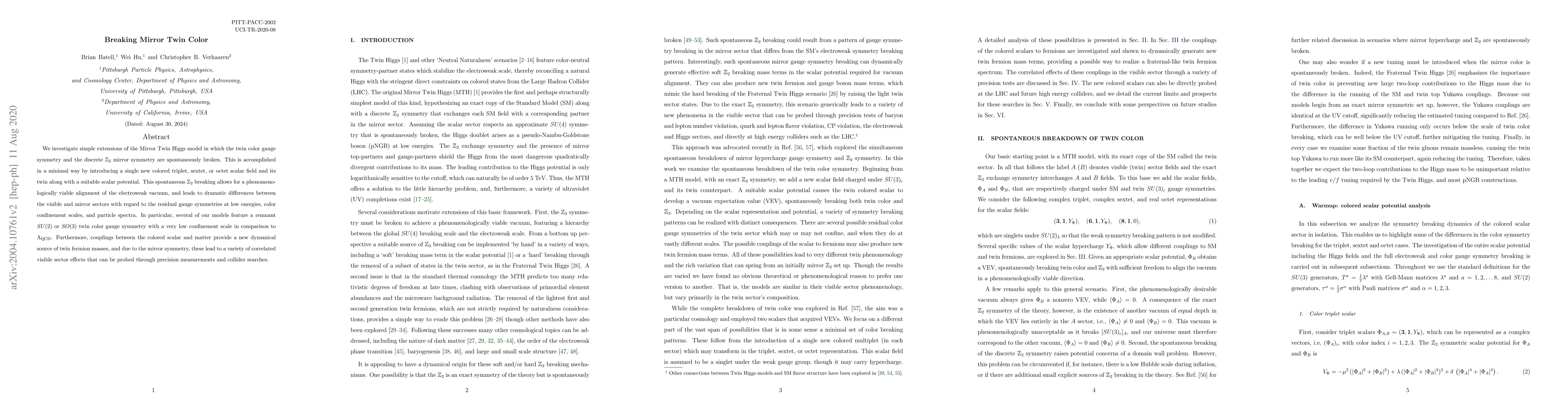 This paper explores extensions of the Mirror Twin Higgs model where twin color and $Z_2$ symmetries are spontaneously broken, introducing new scalar fields. This results in distinct low-energy gauge symmetries and particle spectra between visible and mirror sectors, with potential collider and precision measurement implications.