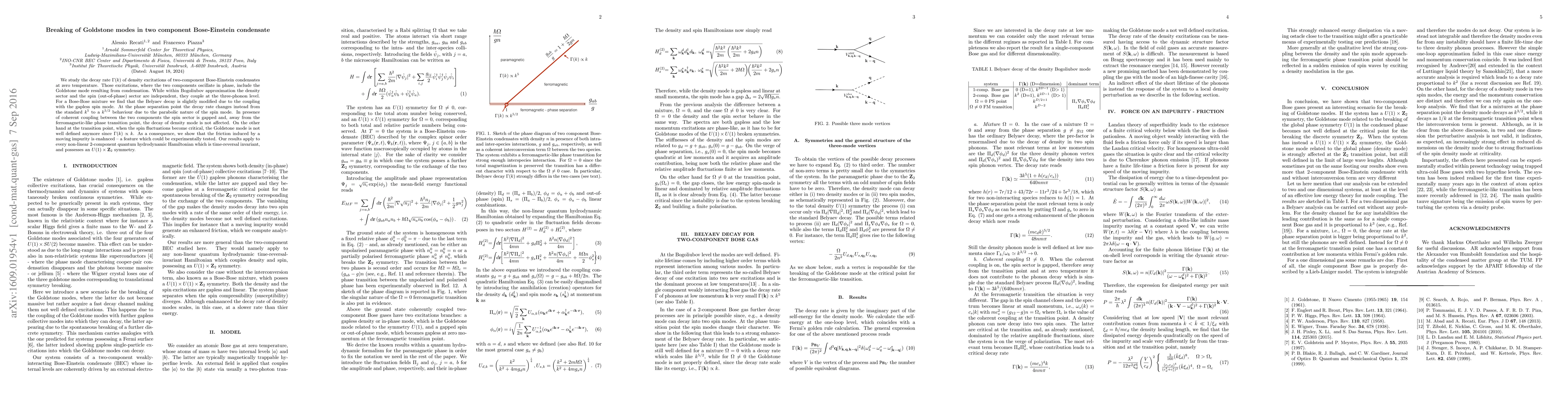 We study the decay rate $\Gamma(k)$ of density excitations of two-component Bose-Einstein condensates at zero temperature. Those excitations, where the two components oscillate in phase, include the Goldstone mode resulting from condensation. While within Bogoliubov approximation the density sector and the spin (out-of-phase) sector are independent, they couple at the three-phonon level. For a Bose-Bose mixture we find that the Belyaev decay is slightly modified due to the coupling with the gapless spin mode. At the phase separation point the decay rate changes instead from the standard $k^5$ to a $k^{5/2}$ behaviour due to the parabolic nature of the spin mode. In presence of coherent coupling between the two components the spin sector is gapped and, away from the ferromagnetic-like phase transition point, the decay of density mode is not affected. On the other hand at the transition point, when the spin fluctuations become critical, the Goldstone mode is not well defined anymore since $\Gamma(k)\propto k$. As a consequence, we show that the friction induced by a moving impurity is enahnced -- a feature which could be experimentally tested. Our results apply to every non-linear 2-component quantum hydrodynamic Hamiltonian which is time-reversal invariant, and possesses an $U(1)\times {\mathbf Z}_2$ symmetry.