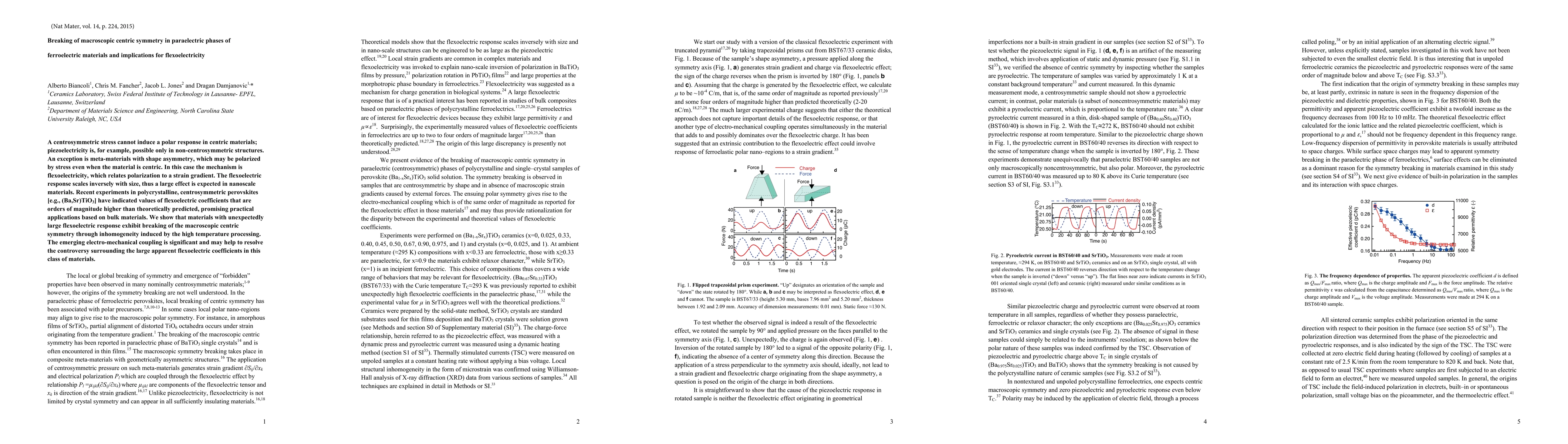 This paper explores the breaking of macroscopic centric symmetry in centrosymmetric ferroelectric materials, revealing an unexpectedly large flexoelectric response due to inhomogeneity from high-temperature processing. This electro-mechanical coupling may explain the high flexoelectric coefficients observed in nanoscale materials, potentially enabling new practical applications.
