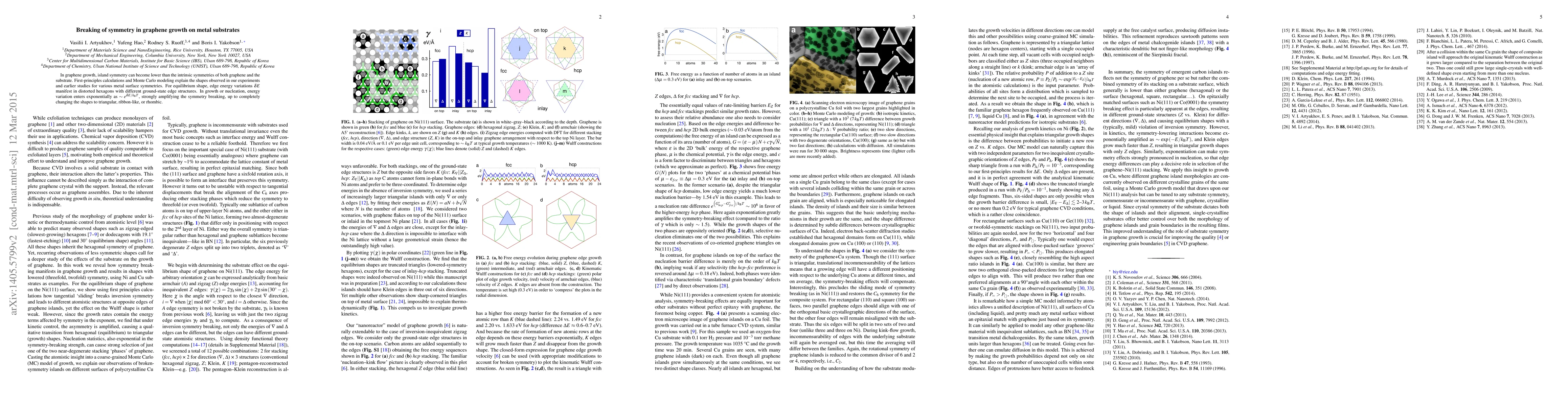 In graphene growth, island symmetry can become lower than the intrinsic symmetries of both graphene and the substrate. First-principles calculations and Monte Carlo modeling explain the shapes observed in our experiments and earlier studies for various metal surface symmetries. For equilibrium shape, edge energy variations $\delta E$ manifest in distorted hexagons with different ground-state edge structures. In growth or nucleation, energy variation enters exponentially as $\sim e^{\delta E / k_{B} T}$, strongly amplifying the symmetry breaking, up to completely changing the shapes to triangular, ribbon-like, or rhombic.