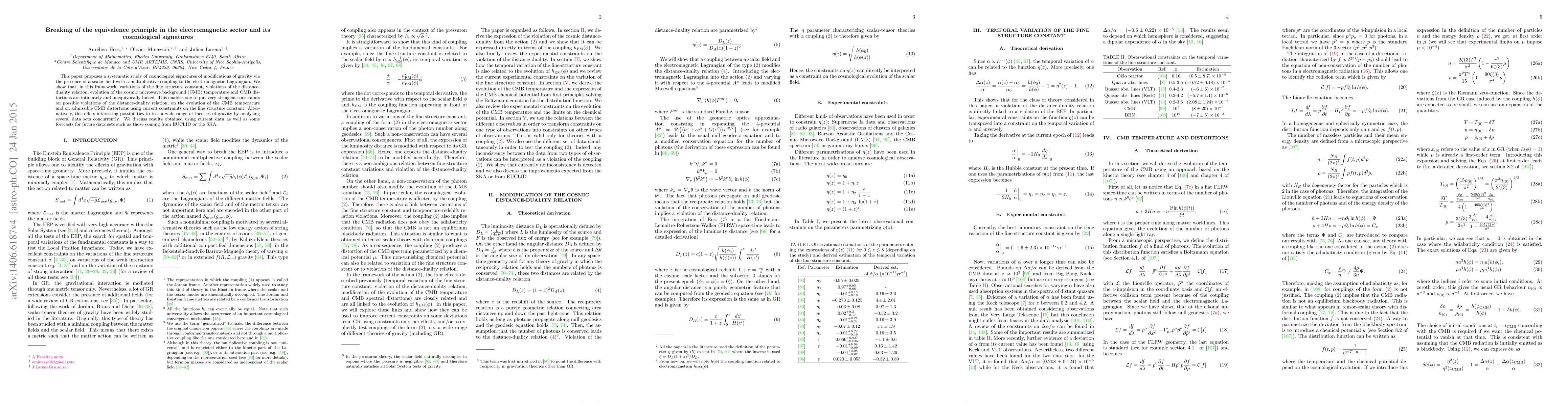 This paper proposes a systematic study of cosmological signatures of modifications of gravity via the presence of a scalar field with a multiplicative coupling to the electromagnetic Lagrangian. We show that, in this framework, variations of the fine structure constant, violations of the distance duality relation, evolution of the cosmic microwave background (CMB) temperature and CMB distortions are intimately and unequivocally linked. This enables one to put very stringent constraints on possible violations of the distance duality relation, on the evolution of the CMB temperature and on admissible CMB distortions using current constraints on the fine structure constant. Alternatively, this offers interesting possibilities to test a wide range of theories of gravity by analysing several datasets concurrently. We discuss results obtained using current data as well as some forecasts for future data sets such as those coming from EUCLID or the SKA.