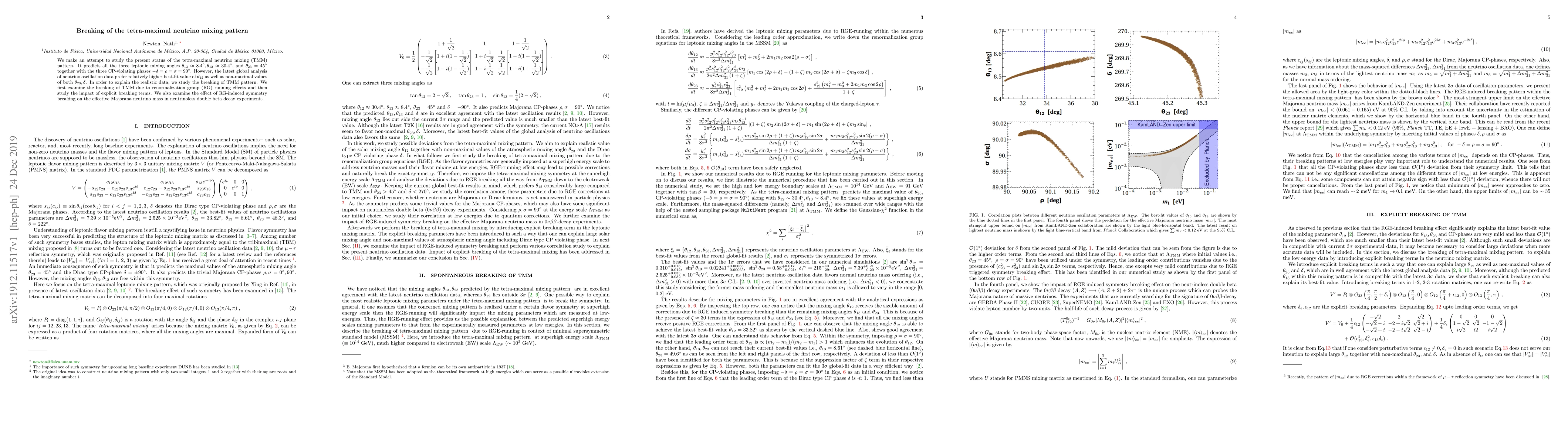 We make an attempt to study the present status of the tetra-maximal neutrino mixing (TMM) pattern. It predicts all the three leptonic mixing angles $\theta_{13} \approx 8.4^\circ, \theta_{12} \approx 30.4^\circ, $ and $\theta_{23} = 45^\circ $ together with the three CP-violating phases $ - \delta = \rho = \sigma = 90^\circ $. However, the latest global analysis of neutrino oscillation data prefer relatively higher best-fit value of $ \theta_{12} $ as well as non-maximal values of both $ \theta_{23}, \delta $. In order to explain the realistic data, we study the breaking of TMM pattern. We first examine the breaking of TMM due to renormalization group (RG) running effects and then study the impact of explicit breaking terms. We also examine the effect of RG-induced symmetry breaking on the effective Majorana neutrino mass in neutrinoless double beta decay experiments.