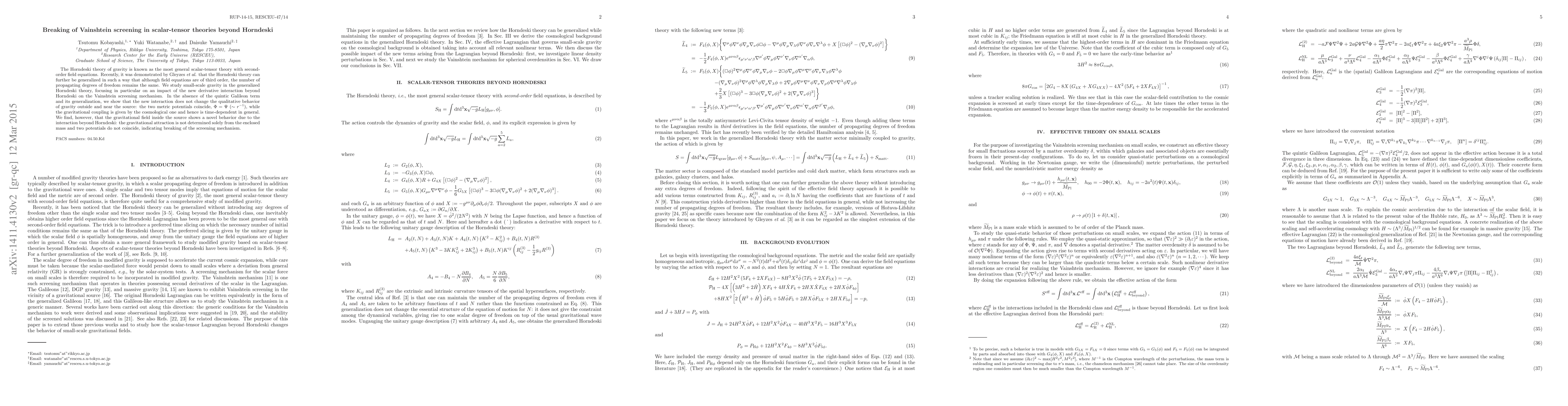 This paper investigates the impact of new derivative interactions beyond the Horndeski theory on the Vainshtein screening mechanism in scalar-tensor gravity. It finds that while the new interactions do not affect the behavior outside and near the source, they break the screening mechanism inside the source, altering the gravitational attraction.
