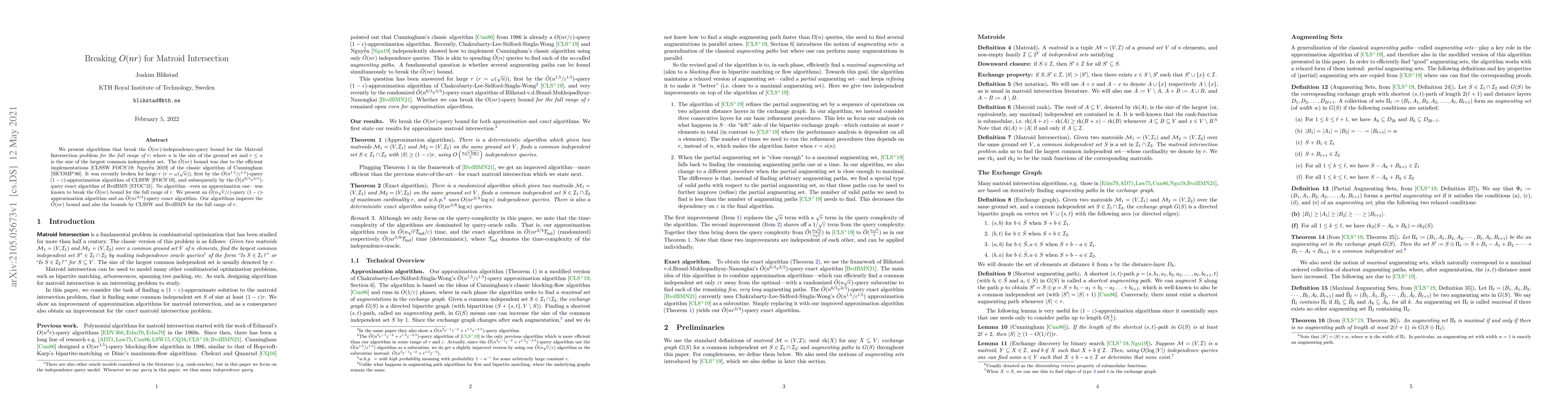 We present algorithms that break the $\tilde O(nr)$-independence-query bound for the Matroid Intersection problem for the full range of $r$; where $n$ is the size of the ground set and $r\leq n$ is the size of the largest common independent set. The $\tilde O(nr)$ bound was due to the efficient implementations [CLSSW FOCS'19; Nguyen 2019] of the classic algorithm of Cunningham [SICOMP'86]. It was recently broken for large $r$ ($r=\omega(\sqrt{n})$), first by the $\tilde O(n^{1.5}/\epsilon^{1.5})$-query $(1-\epsilon)$-approximation algorithm of CLSSW [FOCS'19], and subsequently by the $\tilde O(n^{6/5}r^{3/5})$-query exact algorithm of BvdBMN [STOC'21]. No algorithm, even an approximation one, was known to break the $\tilde O(nr)$ bound for the full range of $r$. We present an $\tilde O(n\sqrt{r}/\epsilon)$-query $(1-\epsilon)$-approximation algorithm and an $\tilde O(nr^{3/4})$-query exact algorithm. Our algorithms improve the $\tilde O(nr)$ bound and also the bounds by CLSSW and BvdBMN for the full range of $r$.