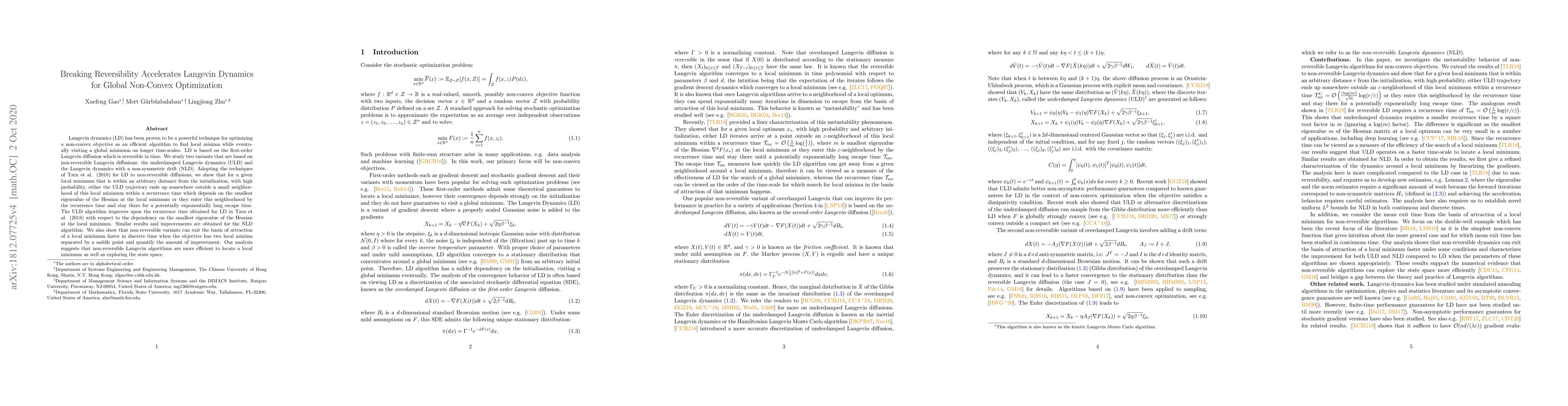 This paper introduces non-reversible Langevin dynamics (ULD, NLD) for non-convex optimization, showing they improve upon the recurrence time of traditional Langevin dynamics (LD) based on the smallest eigenvalue of the Hessian. ULD and NLD algorithms accelerate exiting local minima and exploring state space, offering better efficiency in locating minima. The analysis uses quadratic objective approximations and provides optimal mixing rates in the 2-Wasserstein distance for the two non-reversible algorithms.
