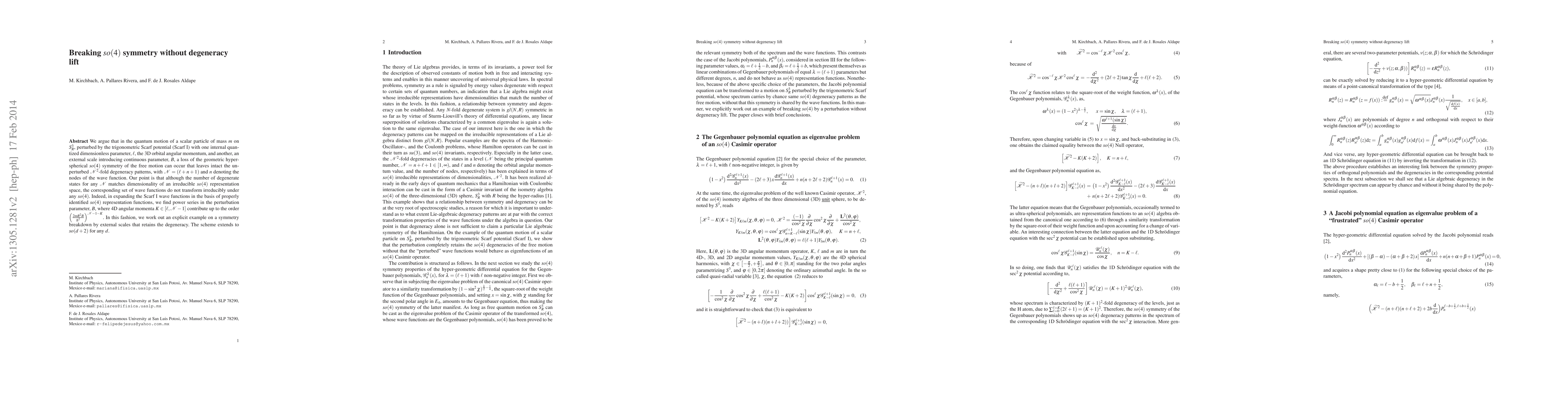 We argue that in the quantum motion of a scalar particle of mass "m" on S^3_R perturbed by the trigonometric Scarf potential (Scarf I) with one internal quantized dimensionless parameter, \ell, the 3D orbital angular momentum, and another, an external scale introducing continuous parameter, B, a loss of the geometric hyper-spherical so(4) symmetry of the free motion can occur that leaves intact the unperturbed {\mathcal N}^2-fold degeneracy patterns, with {\mathcal N}=(\ell +n+1) and n denoting the nodes number of the wave function. Our point is that although the number of degenerate states for any {\mathcal N} matches dimensionality of an irreducible so(4) representation space, the corresponding set of wave functions do not transform irreducibly under any so(4). Indeed, in expanding the Scarf I wave functions in the basis of properly identified so(4) representation functions, we find power series in the perturbation parameter, B, where 4D angular momenta K\in [\ell , {\mathcal N}-1] contribute up to the order \left(\frac{2mR^2B}{\hbar^2}\right)^{{\mathcal N}-1-K}. In this fashion, we work out an explicit example on a symmetry breakdown by external scales that retains the degeneracy. The scheme extends to so(d+2) for any d.