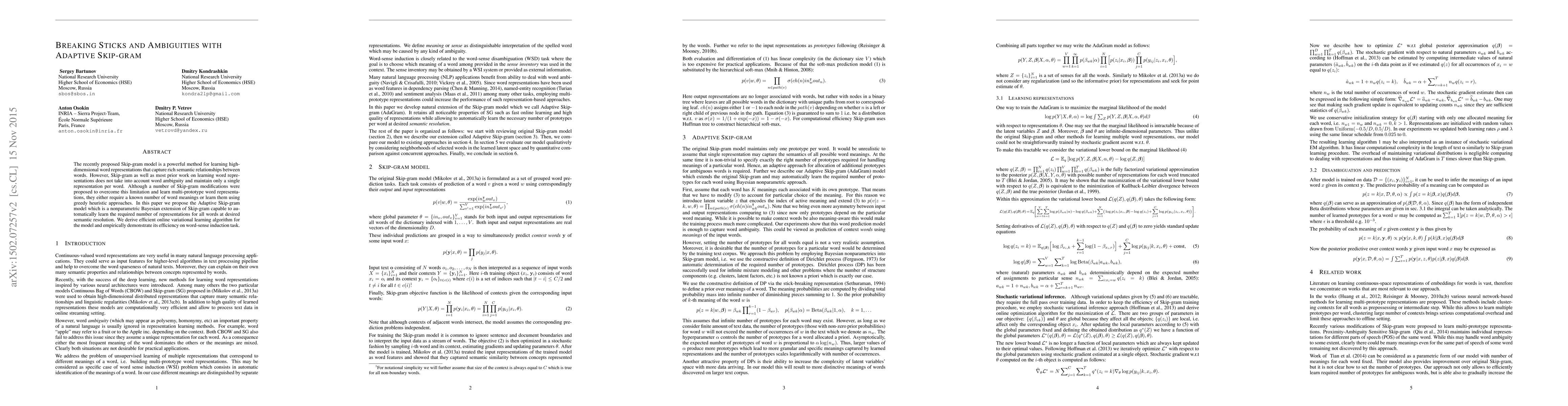 The Adaptive Skip-gram model is a nonparametric Bayesian extension of the Skip-gram model designed to automatically learn multiple word representations to address word ambiguity. It employs an efficient online variational learning algorithm and demonstrates effectiveness in word-sense induction tasks.