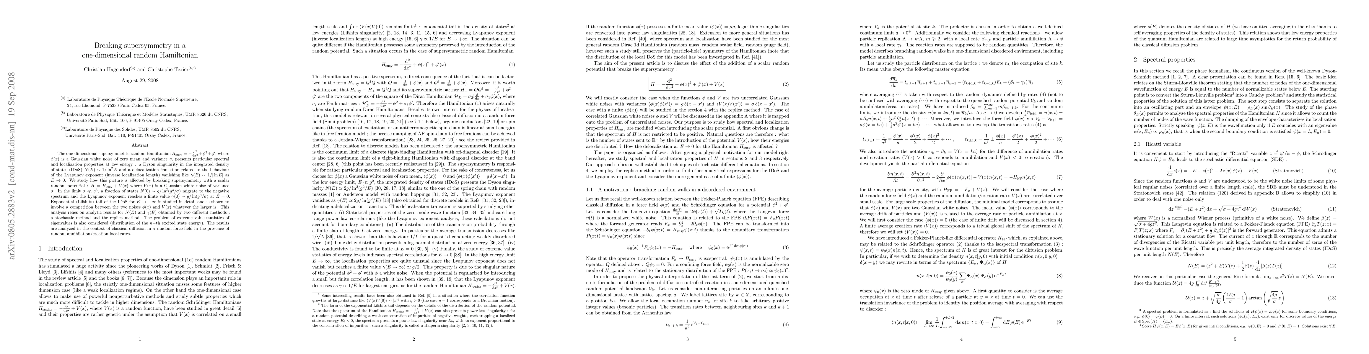 The one-dimensional supersymmetric random Hamiltonian $H_{susy}=-\frac{d^2}{dx^2}+\phi^2+\phi'$, where $\phi(x)$ is a Gaussian white noise of zero mean and variance $g$, presents particular spectral and localization properties at low energy: a Dyson singularity in the integrated density of states (IDoS) $N(E)\sim1/\ln^2E$ and a delocalization transition related to the behaviour of the Lyapunov exponent (inverse localization length) vanishing like $\gamma(E)\sim1/|\ln{}E|$ as $E\to0$. We study how this picture is affected by breaking supersymmetry with a scalar random potential: $H=H_{susy}+V(x)$ where $V(x)$ is a Gaussian white noise of variance $\sigma$. In the limit $\sigma\ll{g}^3$, a fraction of states $N(0)\sim{g}/\ln^2(g^3/\sigma)$ migrate to the negative spectrum and the Lyapunov exponent reaches a finite value $\gamma(0)\sim{g}/\ln(g^3/\sigma)$ at E=0. Exponential (Lifshits) tail of the IDoS for $E\to-\infty$ is studied in detail and is shown to involve a competition between the two noises $\phi$ and $V$ whatever the larger is. This analysis relies on analytic results for $N(E)$ and $\gamma(E)$ obtained by two different methods: a stochastic method and the replica method. The problem of extreme value statistics of eigenvalues is also considered (distribution of the n-th excited state energy). The results are analyzed in the context of classical diffusion in a random force field in the presence of random annihilation/creation local rates.