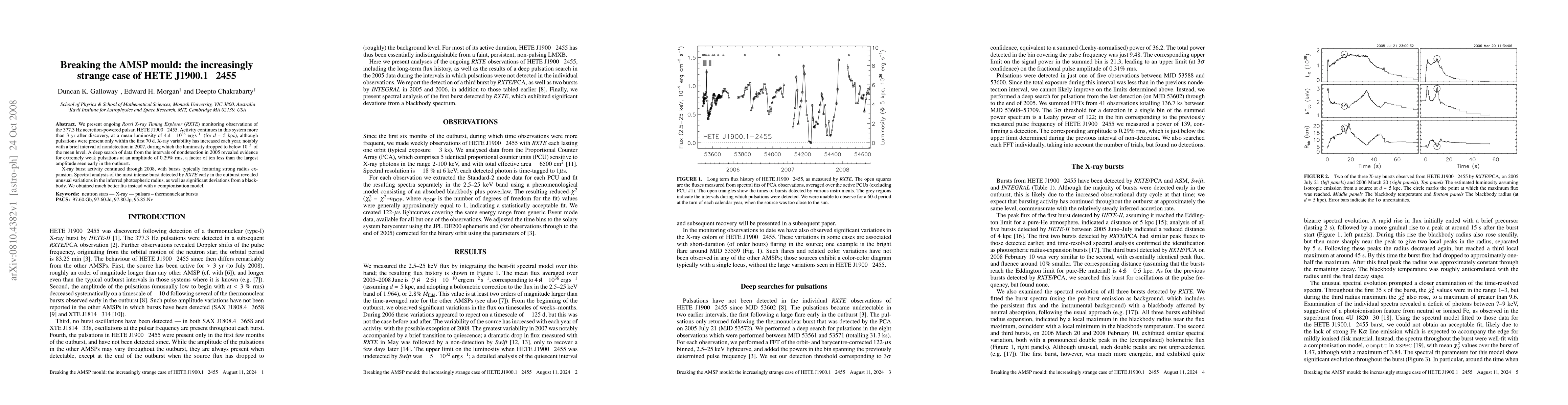 We present ongoing Rossi X-ray Timing Explorer (RXTE) monitoring observations of the 377.3 Hz accretion-powered pulsar, HETE J1900.1-2455 Activity continues in this system more than 3 years after discovery, at a mean luminosity of 4.4e36 erg/s (for d=5 kpc), although pulsations were present only within the first 70 days. X-ray variability has increased each year, notably with a brief interval of nondetection in 2007, during which the luminosity dropped to below 1e-3 of the mean level. A deep search of data from the intervals of nondetection in 2005 revealed evidence for extremely weak pulsations at an amplitude of 0.29% rms, a factor of ten less than the largest amplitude seen early in the outburst. X-ray burst activity continued through 2008, with bursts typically featuring strong radius expansion. Spectral analysis of the most intense burst detected by RXTE early in the outburst revealed unusual variations in the inferred photospheric radius, as well as significant deviations from a blackbody. We obtained much better fits instead with a comptonisation model.